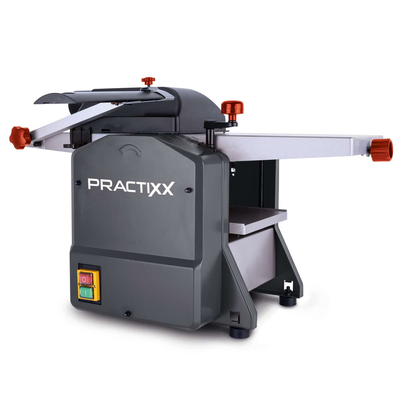Die PX-ADH-8 von Practixx ist eine kombinierte Abricht- und Dickenhobelmaschine für anspruchsvolle Heimwerker. Der plangenaue Abrichttisch aus Aluminium-Druckguss sorgt für beste Hobelergebnisse. Durch die kompakte und stabile Bauweise ist dieses Tischmodell auch für den mobilen Einsatz geeignet. Ein sicherer Stand, die manuelle Höhenverstellung und der Anschluss einer Staubabsaugung, ermöglichen komfortables Arbeiten. Kombinierte Abricht- und DickenhobelmaschineKraftvoller 1250 W Motor für müheloses Abrichten und HobelnKompaktes Tisch-Modell mit einer Durchlasshöhe und -breite von 120 und 204 mmZwei HS-Hobelmesser und eine Messerdrehzahl mit 9000 min-1 für leichtgängiges und präzises HobelnAbrichtanschlag für exakte WinkelVibrationsdämpfende Gummifüße für stabilen StandPräzise Höhenverstellung des Dickenhobels über Handkurbel Zuerst begradigen, dann auf die gewünschte Dicke hobeln – mit dem PX-ADH-8 Dickenhobel von Practixx mit integrierter Abrichthobelmaschine. Das kompakte Gerät mit vibrationsdämpfenden Gummifüßen ermöglicht nicht nur müheloses, sondern auch schwingungsfreies Abrichten und Hobeln. Der in der PX-ADH-8 integrierte Abrichthobel dient zur Herstellung ebener Flächen, insbesondere bei verzogenen und windschiefen Hölzern bzw. zum Abrichten von Brettern, Bohlen oder Kanthölzern. Hierfür wird das Holzwerkstück über den plangenauen oberen Abrichttisch aus Aluminium-Druckguss geführt, wobei die beiden Hobelmesser die Unterseite des Holzes mit einer maximalen Spanabnahme von 2 mm begradigen. Nach dem Abrichten wird das Werkstück gehobelt. Dafür werden der Abrichttisch und der Absaugstutzen nach oben verstellt. Zwei HS-Hobelmesser nehmen bis zu 2 mm an der Oberseite des Werkstückes ab, Die maximale Durchlasshöhe beträgt bei der PX-ADH-8 120 mm. Die gewünschte Hobeldicke kann mit einem Handrad eingestellt werden und bleibt während des gesamten Arbeitsvorganges konstant. So können auch mehrere Werkstücke hintereinander auf dieselbe Dicke gebracht werden – sehr vorteilhaft z.B. beim Bearbeiten von Dielenbrettern. Der 1250 Watt Motor sorgt für eine Messerdrehzahl von 9000 min-1 und damit für eine zügige Bearbeitung. Die hohe Drehzahl der Messerwelle führt zudem zu sehr feinen Oberflächen. Die beiden Hartmetall Messer werden sowohl für das Abrichten als auch für das Hobeln verwendet.