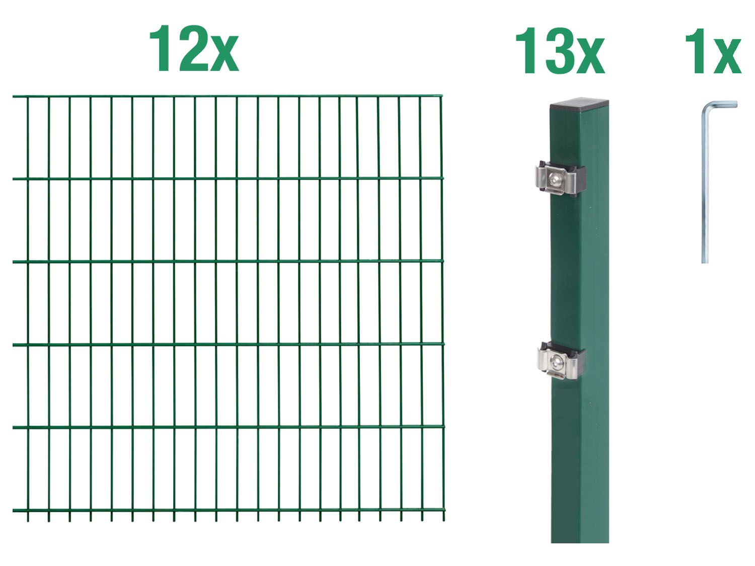 Fertiges Doppelstabmatten-Set inklusive Zubehör Bewärter und solider Gartenzaun aus Stahldraht für zuverlässiges und zugleich preisgünstiges Einzäunen Garantierter Schutz vor Rost und Witterung durch die hochwertige Oberflächenveredelung 15 Jahre Herstellergarantie gemäß den Garantie-Bedingungen Zubehör Für einen kompletten Zaun und zusätzlichen Eingängen kannst du das Stabmattenzaun-Grundset mit weiteren Anbausets und Toren ergänzen. Maße & Gewicht Mattenbreite: ca. 2000 mm Maschenweite: ca. B 50 x H 200 mm Stahldraht waagerecht: ca. Ø 6 mm Staldraht senkrecht: ca. Ø 5 mm Pfostenstärke: ca. B 40 x T 60 mm Bohrabstand der Pfosten: ca. 400 mm Zaunlänge: 12 m Mattenhöhen: ca. 1000 mm / 1200 mm / 1400 mm / 1600 mm Gewicht: ca. 122 kg / 103 kg / 140 kg / 150 kg Zaunlänge: 14 m Mattenhöhen: ca. 1000 mm / 1200 mm Gewicht: ca. 120 kg / 142 kg Zaunlänge: 16 m Mattenhöhen: ca. 1000 mm / 1200 mm Gewicht: ca. 137 kg / 162 kg Zaunlänge: 18 m Mattenhöhen: ca. 1000 mm / 1200 mm Gewicht: ca. 153 kg / 181 kg Zaunlänge: 20 m Mattenhöhen: ca. 1000 mm / 1200 mm / 1600 mm Gewicht: ca. 170 kg / 200 kg / 245 kg Zaunlänge: 22 m Mattenhöhen: ca. 1000 mm / 1200 mm Gewicht: ca. 186 kg / 220 kg Zaunlänge: 24 m Mattenhöhen: ca. 1000 mm / 1200 mm Gewicht: ca. 203 kg / 240 kg Zaunlänge: 26 m Mattenhöhen: ca. 1000 mm / 1200 mm Gewicht: ca. 219 kg / 259 kg Zaunlänge: 28 m Mattenhöhen: ca. 1000 mm / 1200 mm Gewicht: ca. 236 kg / 278 kg Zaunlänge: 30 m Mattenhöhen: ca. 1000 mm / 1200 mm / 1600 mm Gewicht: ca. 252 kg / 298 kg / 340 kg Lieferumfang Zaunlänge: 12 m 6 Matten 7 Pfosten mit Klemmlasche 1 Inbusschlüssel Zaunlänge: 14 m 7 Matten 8 Pfosten mit Klemmlasche 1 Inbusschlüssel Zaunlänge: 16 m 8 Matten 9 Pfosten mit Klemmlasche 1 Inbusschlüssel Zaunlänge: 18 m 9 Matten 10 Pfosten mit Klemmlasche 1 Inbusschlüssel Zaunlänge: 20 m 10 Matten 11 Pfosten mit Klemmlasche 1 Inbusschlüssel Zaunlänge: 22 m 11 Matten 12 Pfosten mit Klemmlasche 1 Inbusschlüssel Zaunlänge: 24 m 12 Matten 13 Pfosten mit Klemmlasche 1 Inbusschlüssel Zaunlänge: 26 m 13 Matten 14 Pfosten mit Klemmlasche 1 Inbusschlüssel Zaunlänge: 28 m 14 Matten 15 Pfosten mit Klemmlasche 1 Inbusschlüssel Zaunlänge: 30 m 15 Matten 16 Pfosten mit Klemmlasche 1 Inbusschlüssel””
