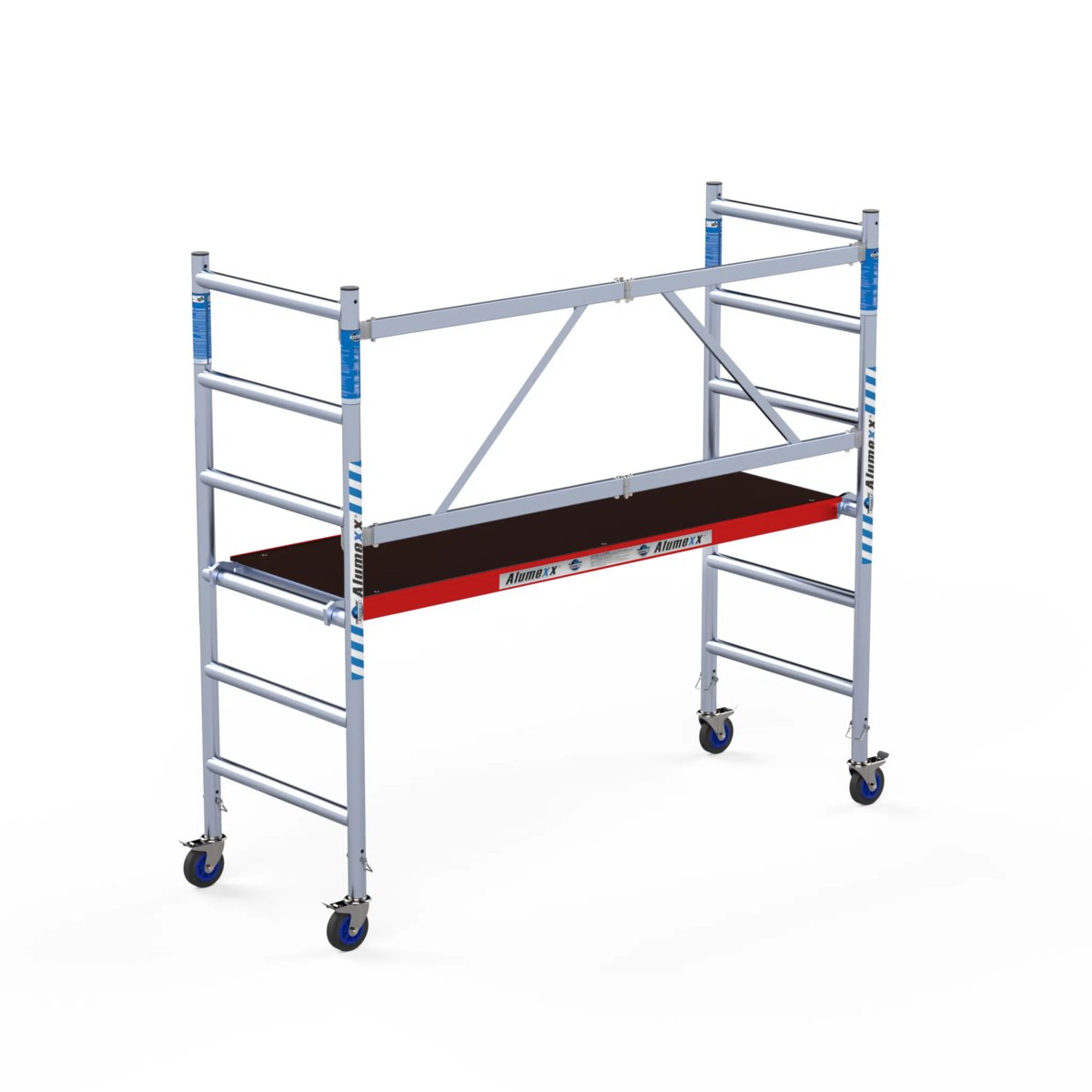 Alumexx Zimmergerüst Smart Red, eine preisgünstige Variante der Zimmergerüste Das Faltgerüst zeichnet sich durch seine extreme Robustheit aus und ist sowohl für den Innenbereich als auch für den Einsatz im Freien bestens geeignet. Dank des stabilen und einfach zu bedienenden Faltsystems lässt es sich in nur einer Minute vollständig aufbauen und ist sofort einsatzbereit. Die Aluminiumrohre haben einen besonders großen Durchmesser von 50 mm, was zusätzliche Stabilität gewährleistet. Ausgestattet mit vier bremsbaren Rollen von 125 mm Durchmesser und einer leichten, hochwertigen Plattform ohne Luke, bietet das Gerüst höchste Flexibilität und Sicherheit. Es entspricht der DIN-EN1004-Norm und ist TÜV-zertifiziert.Lieferumfang: 1x Falteinheit mit 6-Sprossen-Rahmen 1x Plattform Red ohne Luke 4x Doppelbremsrolle 125 mm 4x Verriegelungsclip