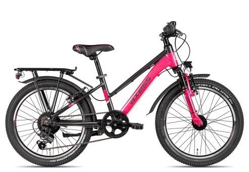 Für Fahrkomfort abseits befestigter Wege, sorgen die profilierten Reifen in Kombination mit einer gefederten Gabel von Zoom., Das Rücklicht verfügt über eine Standlichtfunktion und beide Leuchten werden kraftsparend durch einen Shimano-Nabendynamo gespeist., Ein Seitenständer sowie ein kleiner Gepäckträger runden das alltagstaugliche Ausstattungspaket des Axess Adventure 6 20 ab., Das verbaute Shimano-Schaltwerk sorgt dabei für verlässliche Gangwechsel – ideal für erste Fahrrad-Touren mit der Familie., Das Axess Adventure 6 20 Kinderfahrrad mit 20 Zoll-Laufrädern ist für junge Fahrer ab etwa 120 Zentimetern, die ein praktisches und optisch sportives Rad für den Alltag suchen., Die beiden Felgenbremsen an Vorder- und Hinterrad ermöglichen ein kontrolliertes Abbremsen und sparen Gewicht., So kann die Beleuchtung auch tagsüber eingeschaltet bleiben und die Sichtbarkeit wird verbessert., Mit einer 6-Gang Shimano Kettenschaltung, die über