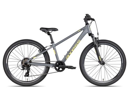 24 Zoll Mountainbikes empfehlen sich für MTB-Fans ab einem Alter von grob 8 Jahren., Die 7 auswählbaren Gangstufen der Shimano Schaltung werden dabei kindgerecht per Drehgriffschalter bedient., Mit dem 1×7 Gang Shimano Tourney Antrieb können junge Offroadfans erste Schaltmanöver durchführen, ohne überfordert zu werden., So sind auch Fahrten abseits der Straße gut zu kontrollieren., Für die ersten Offroadfahrten ist das Axess Stipe 24 mit einer leichten Felgenbremse und einer 50 mm SR Suntour Federgabel ausgestattet., Dazu sind die 24 Zoll Laufräder mit feinprofilierten Reifen, wie sie oft im Gravel-Segment zu finden sind, ausgestattet., So bleiben sie schön sauber und lange in Funktion., Das erste eigene Offroadbike?, Axess empfiehlt sein Stipe 24 ab einem Alter von etwa 8 Jahren., Am leichten Aluminiumrahmen sind Befestigungsösen für passendes Zubehör vorhanden., Mit dem Modell Stipe 24 zeigt dir Axess den Einstieg in die Welt der 24