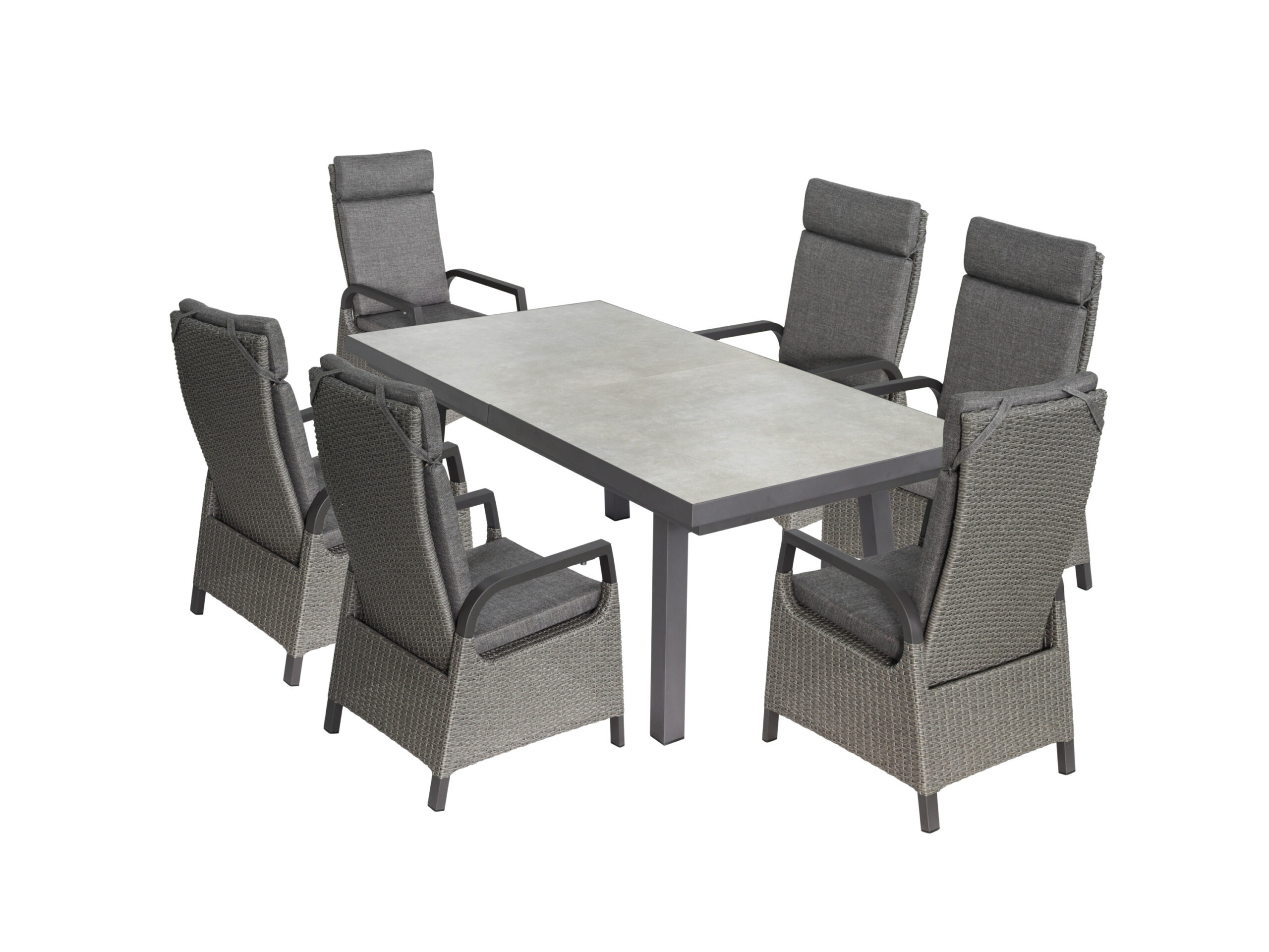 bellavista – Home & Garden® Dining-Set “Ontario/Dallas”; 7-teilig, mit Ausziehfunktion Ob im Garten, auf der Terrasse oder im Esszimmer – die Dining-Kombination aus dem Tisch “Ontario” und den Hochlehner-Sesseln “Dallas” von bellavista – Home & Garden® schafft den idealen Rahmen für entspannte Mahlzeiten und gesellige Runden mit Familie und Freunden. Der Tisch “Ontario” überzeugt mit einem robusten Aluminiumrahmen in elegantem Anthrazit, der modernes Design mit Stabilität verbindet. Die Tischplatte aus hochwertigen Keramikfliesen ist langlebig und verleiht dem Tisch eine edle, zeitlose Optik. Ein besonderes Feature ist die innovative Ausziehfunktion: Die Tischplatte lässt sich im Handumdrehen von 200 cm auf 260 cm erweitern – und das von nur einer Person. Ein einfacher Zug an einer Seite setzt die gegenüberliegende Seite synchron in Bewegung. Der versteckte Mittelteil hebt sich automatisch und schließt die Lücke. Ein kurzer Griff unter der Tischplatte fixiert die Erweiterung – perfekt, um spontan mehr Gäste willkommen zu heißen. Ebenso schnell lässt sich der Tisch wieder verkleinern, ideal für flexible Nutzung. Die Hochlehner-Sessel “Dallas” ergänzen das Ensemble mit einer stilvollen Kombination aus leichtem Aluminium und modernem Polyrattan. Das stabile Gestell erleichtert die Handhabung, während das anthrazitfarbene Polyrattan für eine harmonische Optik sorgt. Für individuellen Komfort sind die Sessel mit Gasdruckfedern ausgestattet, die eine stufenlose Anpassung der Rückenlehne über einen Knopf an der Armlehne ermöglichen. Die extra dicken Auflagen bieten höchsten Sitzkomfort. Praktisch: Die Bezüge lassen sich dank Reißverschluss einfach abnehmen und bei 30 °C waschen – für unkomplizierte Reinigung und dauerhafte Frische. Verleihe deinem Zuhause Stil und Komfort – mit der Dining-Kombination “Ontario” und “Dallas” von bellavista – Home & Garden®. Genieße besondere Momente in bester Gesellschaft, bei zeitlosem Design und höchstem Komfort. Produktmerkmale table{width:100%;}td{padding-right: 30px; padding: 0.5rem; border-bottom: 0.0625rem solid #e3e4e5;} tr:nth-child(odd) {background-color: #F2F3F4;} Serie: Tisch “Ontario” mit Sesseln “Dallas” Farbe: anthrazit; grau Funktion: automatisch ausziehbar Witterungsbeständig: ja Material: Gestell: Aluminium, Tischplatte: Keramik, Geflecht: Polyrattan, Auflagenbezug: 100 % Polypropylene, Füllung Sitzkissen: 90 % Polyurethane + 10 % Polyester, Füllung Rückenkissen: 100 % Polyester Max. Belastung: Tisch: mittlere Tischplatte ca. 20 kg, äußere Tischplatten ca. 40 kg, Sessel: ca. 120 kg pro Sessel Maße: Tisch: ca. L 200/260 x B 100 x H 76 cm, Sessel: ca. T 64 x B 57,5 x H 108 cm Gewicht: Tisch: ca. 64 kg, Sessel: ca. 9 kg pro Sessel mit Auflage