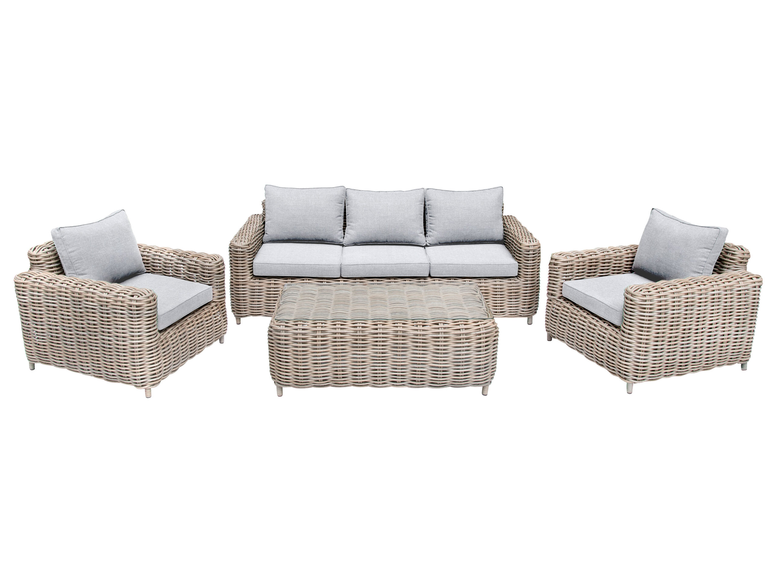 bellavista – Home & Garden® Luxus Loungeset “Merando”; 4-teilig Lehnen Sie sich zurück in die bequeme und wunderschöne Luxus-Lounge “Merando” von bellavista – Home & Garden®. Die rustikale und zugleich elegante Lounge bietet bequem Platz für bis zu 5 Personen, sowie einen großzügigen Tisch mit einer transparenten Sicherheitsglasplatte. Die “Merando” ist mit ihrem extra breiten und von Hand geflochtenen Polyrattan ein echter Hingucker. Sie eignet sich sowohl zum Entspannen im Freien als auch zum charmanten Wohnen im Innenbereich. Die extra dicken Sitz- und Rückenkissen sorgen für den zusätzlichen Komfort. Alle Bezüge sind mit Reißverschlüssen versehen und können schnell und einfach abgenommen und bei 30° gewaschen werden. Produktmerkmale Serie: Merando Set: 4-teilig Funktion: – Witterungsbeständig: – Material: Rahmen: Aluminium, Rattan: Kunststoff, Kissen: Polyester Max. Belastung: Sofa/Sessel: ca. 120 kg je Sitzfläche; Tisch: ca. 30 kg Maße: Sofa: ca. 210 x 95 x 73 cm, Sessel: ca. 92 x 95 x 73 cm, Tisch: ca. 120 x 45 x 62 cm Gewicht: ca. 120 kg Lieferumfang: 1x 3-Sitzer-Sofa, 2x Sessel, 1x Beistelltisch, inkl. Sitz- und Rückenkissen table{width:100%;}td{padding-right: 30px; padding: 0.5rem; border-bottom: 0.0625rem solid #e3e4e5;} tr:nth-child(odd) {background-color: #F2F3F4;}