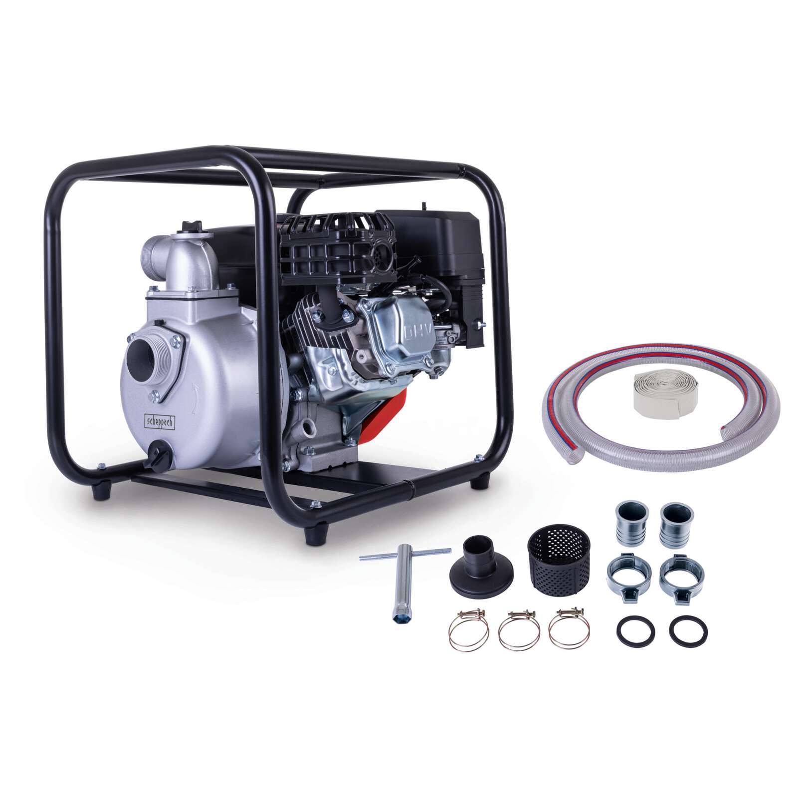 Benzin Wasserpumpe PWP32 Scheppach – 32.000 L/h | 30m Föderhöhe | 7m Ansaughöhe | 3 bar Gartenpumpe | 5,3 PS / 212ccm | inkl. Schlauchpaket