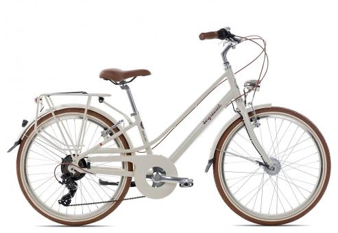 So kann das Licht jederzeit ohne zusätzliche Anstrengung eingeschaltet bleiben., Dieser wird ganz einfach per Shimano Nabendynamo mit Energie versorgt., Dazu ergänzen die passend ausgewählten Kontrastfarben von der 24 Zoll Reflexbereifung, dem Sattel und der Lenkergriffe in Lederoptik, eine stilvolle Akzentuierung., Bergrausch Marlies 6: Ein wunderbar designtes 24 Zoll Trekkingbike für Kinder ab ca. 8 Jahren und einer Körpergröße von gut 135 cm ., Einen klassisch-nostalgischen Touch, geben polierte Elemente wie Lenkervorbau, Sattelstütze, Steuerrohrplakette und Nostalgiescheinwerfer., Eine bewährte Shimano Tourney Kettenschaltung bietet dabei mit ihren 6 Gängen ein einfaches Schaltspektrum, um angenehm zu cruisen., Ein leichtes, elegantes Kinderfahrrad, mit dem gewissen Etwas: Das Bergrausch Marlies Trekkingfahrrad, hier in der 24 Zoll Variante mit 6-Gang Shimano Kettenschaltung., Die starke Lenkerkrümmung und die aufrechte Sitzposition