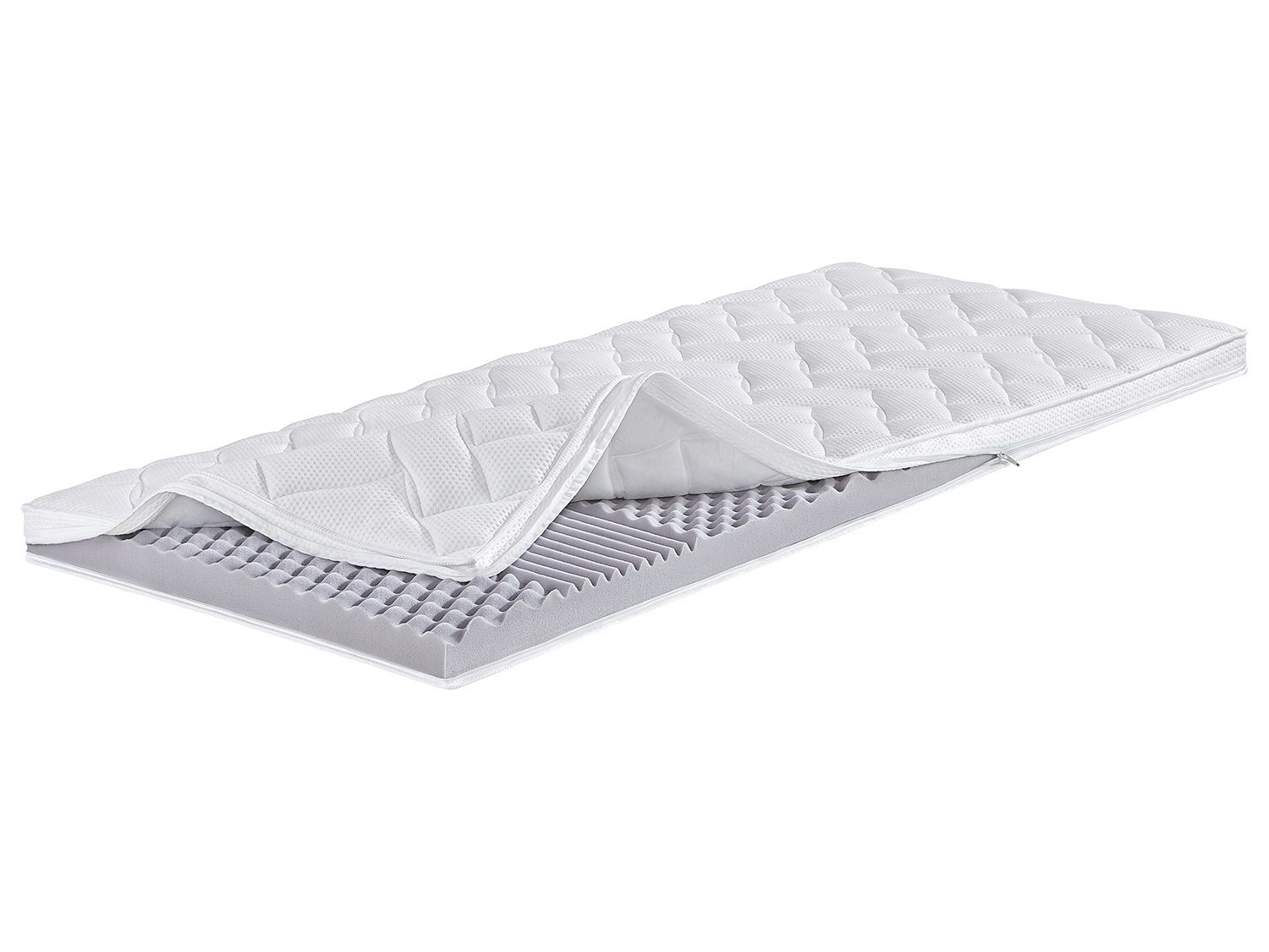 XXL-Kaltschaum-Topper der Spitzenklasse Noppenkaltschaum-Oberfläche für hervorragende Druckentlastung und Belüftung Optimale Körperanpassung durch 7 abgestimmte Liegezogen Die Matratzenauflage bietet ein trockenes Schlafklima,durch atmungsaktive Materialien Der Bezug ist beidseitig mit Klimafaser versteppt und waschbar bis 60°C Der 4-Seiten-Reisverschluss ermöglicht ein leichtes Ab- und Beziehen der Matratzenauflage Gesamthöhe: ca. 8 cm Hergestellt in Deutschland Material Außenbezug: 60 % Polyester, 40 % Viskose Steppfüllung: 100 % Polyester Bezuginnenseite: 100 % Polyester Maße ca. B 90 x L 190 cm ca. B 80 / 90 / 100 / 120 / 140 / 160 / 180 x L 200 cm Raumgewicht 35 kg/m³ Gewicht 90 x 190 cm: 7 kg 80 x 200 cm: 6,5 kg 90 x 200 cm: 7,5 kg 100 x 200 cm: 8 kg 120 x 200 cm: 9,5 kg 140 x 200 cm: 11 kg 160 x 200 cm: 12,5 kg 180 x 200 cm: 13,5 kg