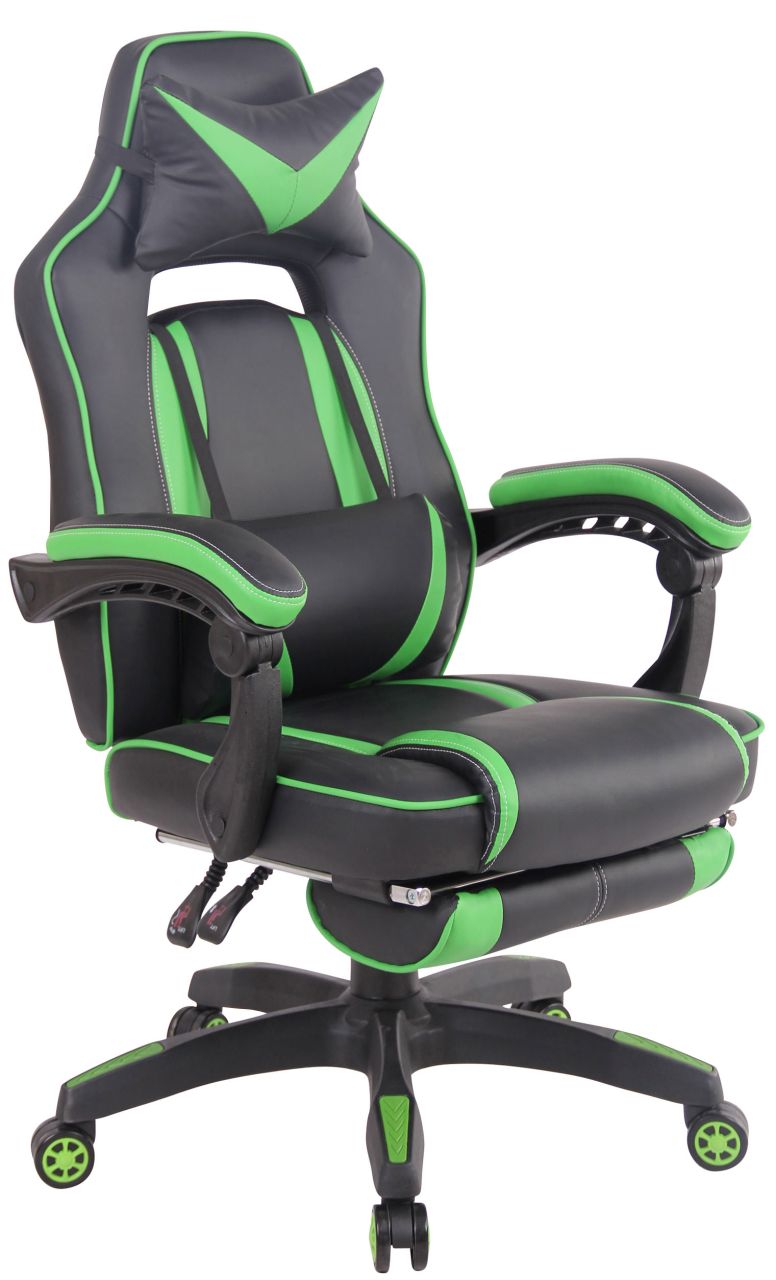 Bürostuhl Heat – Hoher Sitzkomfort zum Arbeiten und Entspannen! Der Schreibtischstuhl Heat im ansprechenden sportlichen Design kombiniert Funktionalität und Komfort in bester Art und Weise. Die angenehm gepolsterte Sitzfläche, sowie auch die Armlehnen, sind mit pflegeleichtem Kunstleder bezogen. Das abnehmbare Nacken- und Lendenwirbelkissen sorgen nicht nur für eine gesunde Sitzhaltung, sondern auch für eine langanhaltende Gemütlichkeit. Die leicht verstellbare Rückenlehne und die integrierte Fußstütze sorgen zusätzlich für eine angenehme Pause zwischendurch. Dabei steht der Bürostuhl standsicher auf fünf Leichtlaufrollen und einem Gestell aus Kunststoff. Egal ob Hart- oder Teppichböden – man kann immer leicht und locker über den Boden rollen. Materialzusammensetzung: 100% Polyurethan Ca. Maße: Gesamthöhe: 114 – 124 cm Gesamtbreite: 68 cm Gesamttiefe: 61 cm Sitzhöhe: 48 – 58 cm Sitzfl…