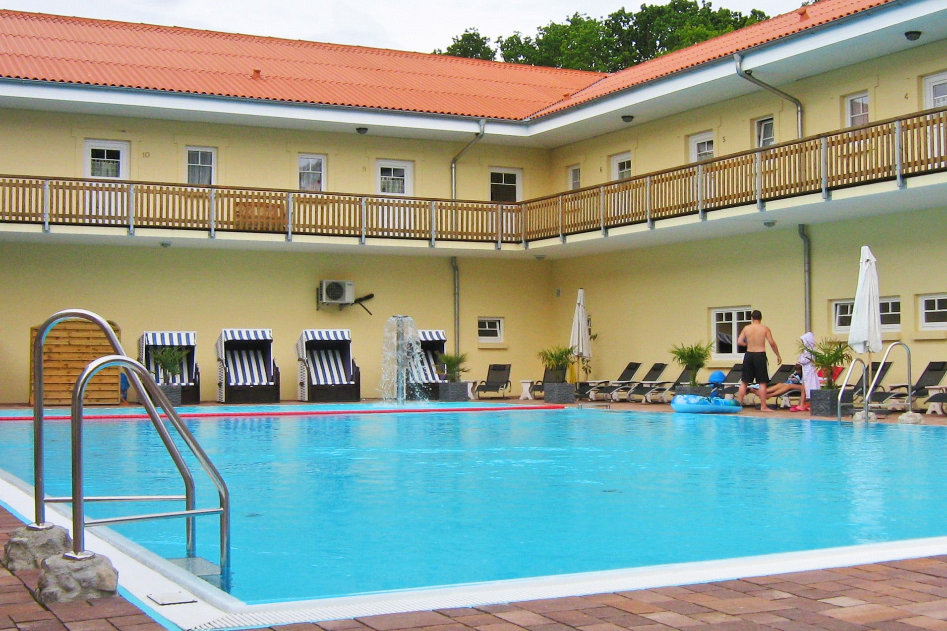 Die entspannte Atmosphäre dieser weitläufigen Anlage von Camping Markgrafenheide fällt sofort auf. Die Stellplätze liegen teils unter hohen Bäumen, es gibt aber auch Plätze mit etwas weniger Schatten. Man kann auch schicke Bungalows und Ferienwohnungen mit Veranda und Terrasse mieten. Und wenn das Ostseewetter mal nicht mitspielt: auch ein sehr schöner großer Wellnessbereich mit Innen- und Außenpool und Saunen ist für alle da! Die Openair-Cocktailbar ist zudem ein beliebter Treffpunkt unter den Gästen. Oder besuchen Sie eines der Restaurants, u.a. das stilvolle ‘Fienschmecker Restaurant’. Täglich frische Brötchen und ein reichhaltiges Frühstücksbuffet sind auch zu haben. Dazu kommen Kaufhalle, Imbiss, Eisdiele, E-Bike Verleih, Bücherstube, und Kinderbetreuung!