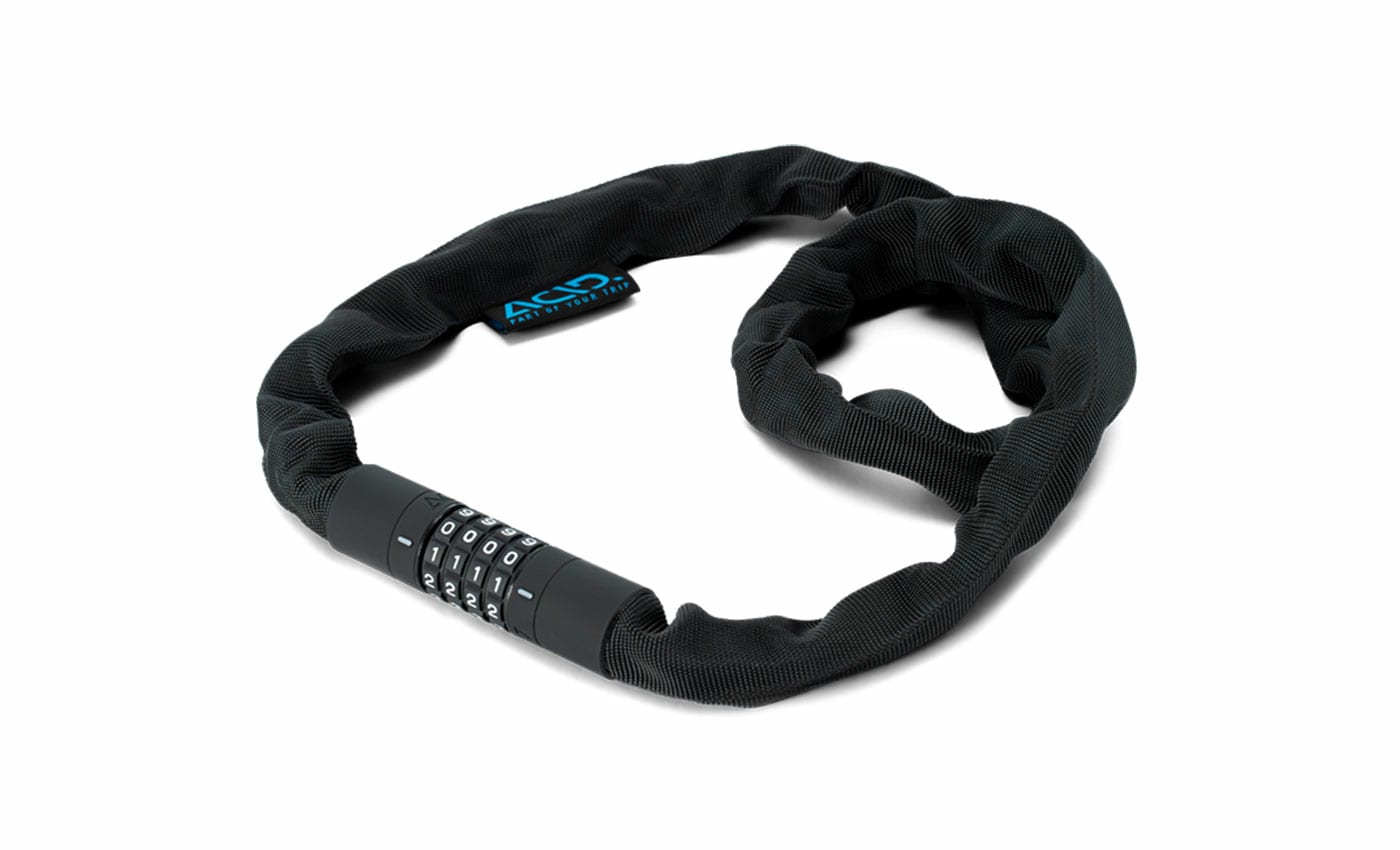 Kettenschloss Cube Acid Corvid Pro in Schwarz Das extra sichere Kettenschloss der CORVID C Serie zeichnet sich nicht nur durch seine geräuscharme und robuste Kette aus, sondern auch durch seinen besonders reißfesten sowie langlebigen Textilmantel. Das Schloss ist komplett mit weichen Kunststoffoberflächen ausgestattet um den Rahmen vor Kratzern und die Technik vor Korrosion zu schützen. Zudem bietet die GRIP+ Oberfläche an Schlosskörper und den frei einstellbaren Kombinationsrädern maximale Griffigkeit
