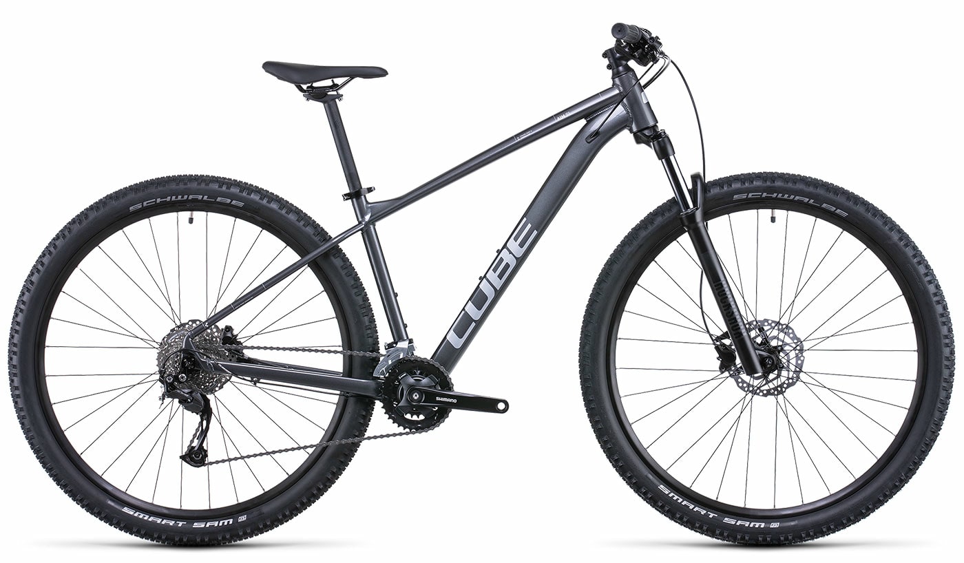 Cube Aim SL in graphite n metal Der brandneue Aim Rahmen besticht 2022 mit einem überarbeiteten, supercleanen Look. Verantwortlich dafür: die im Smooth Welding Verfahren hergestellten Verbindungen am Steuerrohr und Sattelstützenprofil. Außerdem haben wir ihm ein geschraubtes Tretlager gegeben und die Züge ins Innere verlegt, damit sie ihre Aufgabe lange machen und leicht gewartet werden können. Es gibt sogar eine Aufnahme für eine Flat-Mount-Scheibenbremse, die nahtlos in die Seitenständeraufnahme integriert ist. Montagepunkte für ACID Schutzbleche und Gepäckträger sind auch mit dabei. Die überarbeitete Geometrie hat ein niedrigeres Oberrohr für noch zuverlässigeres Handling und lässt viel Platz für breite, griffige, komfortabel rollende 2.25 Zoll Reifen. Auch haben wir unser SizeSplit System jetzt breiter aufgestellt – dadurch findet jeder und jede die perfekt passende Aim Rahmengröße für sich. Was nützt einem volle Power, wenn sie nicht in die richtigen Bahnen gelenkt wird? Aus diesem Grund haben wir das brandneue Aim SL mit geschmeidig und zuverlässig dämpfenden 100 mm Federweg in Form einer RockShox Gabel inklusive Lockout-Funktion ausgestattet. Im Team mit kräftig zupackenden hydraulischen Scheibenbremsen von Shimano, einem konfizierten Steuerrohr und griffigen 2.25 Zoll breiten Reifen ist volle Kontrolle zu jeder Zeit garantiert, egal wo im Gelände. Der perfekte Gang per Fingerzeig und damit die perfekte Übersetzung auf allen Trails liefert die breit gefächerte 2×9-Gang Schaltung von Shimano. Und weil die Züge ins Innere des Rahmens verlegt wurden, kann selbiger sogar mit einer versenkbaren Sattelstütze nachgerüstet werden. Worauf noch warten? Aufsitzen und los geht’s! Video: CMPT Series [2022] – CUBE Bikes Official