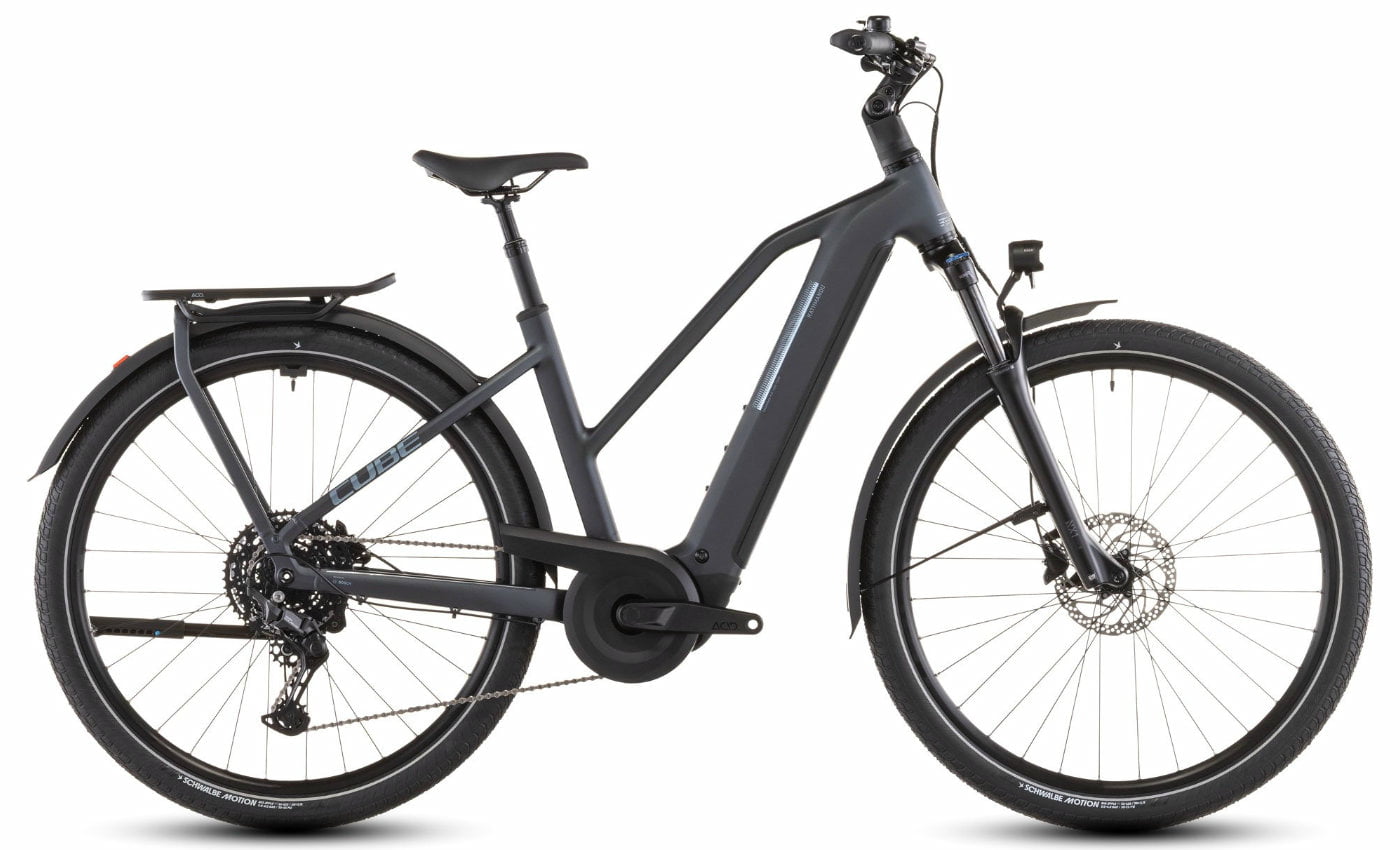 Cube Kathmandu Hybrid ONE 800 Trapez – metallicgrey’n’grey Das Cube Kathmandu Hybrid ONE 800 Trapez in metallicgrey’n’grey ist ein zuverlässiges und komfortables E-Trekkingbike mit tieferem Einstieg für mehr Fahrkomfort. Der leistungsstarke Bosch Performance Line CX Motor mit bis zu 85 Nm Drehmoment und der integrierte 800 Wh PowerTube Akku liefern reichlich Energie für Alltag, Touren und Reisen. Dank der Efficient Comfort Geometry und der internen Kabelführung überzeugt das Rad mit angenehmem Fahrgefühl und elegantem Look. Die Shimano Cues 10-fach Schaltung sorgt für eine gleichmäßige Kraftübertragung, während die SR Suntour NX1-32 LO Air Federgabel mit 100 mm Federweg Komfort auf langen Touren bietet. Zusammen mit der gefederten Sattelstütze und dem verstellbaren Vorbau entsteht eine entspannte Sitzposition. Für Sicherheit bei allen Bedingungen sorgen die hydraulischen Shimano Scheibenbremsen. Mit Beleuchtung, Schutzblechen, Schloss, Ständer und dem stabilen IC 3.0 Gepäckträger ist das Bike alltagstauglich ausgestattet und jederzeit einsatzbereit. Rahmen: Aluminium Superlite, Efficient Comfort Geometry, IC 3.0 Rahmenform: Trapez – komfortabler Einstieg Motor: Bosch Performance Line CX, 85 Nm Akku: Bosch PowerTube 800 Wh, integriert Display: Bosch Purion 200 Schaltung: Shimano Cues 10-fach Bremsen: Shimano hydraulische Scheibenbremsen Federgabel: SR Suntour NX1-32 LO Air, 100 mm Sattelstütze: gefedert, 31.6 mm Laufräder: ACID Pro 25, Tubeless Ready Reifen: Schwalbe Motion Big Apple, 55 mm Ausstattung: Gepäckträger IC 3.0, Beleuchtung, Schutzbleche, Ständer, Schloss Gewicht: ca. 28,4 kg Farbe: metallicgrey’n’grey Mit dem Cube Kathmandu Hybrid ONE 800 Trapez metallicgrey’n’grey bist du bestens gerüstet für Alltag und Abenteuer – komfortabel, vielseitig und stark motorisiert.