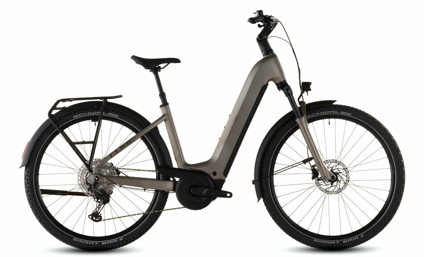 Cube Nuride Hybrid Pro 800 Wave – flashstone’n’chrome Das Cube Nuride Hybrid Pro 800 in flashstone’n’chrome vereint die Vielseitigkeit eines Mountainbikes mit dem Komfort eines Cityrads und der Ausstattung eines Tourenbikes. Der hochwertige Wave-Rahmen ermöglicht komfortables Auf- und Absteigen. Mit dem kräftigen Bosch Performance Line CX Motor mit 100 Nm Drehmoment und dem ausdauernden PowerTube 800 Akku meisterst du jeden Anstieg und lange Touren souverän. Die präzise Shimano XT 12-fach Schaltung sorgt für geschmeidige Gangwechsel, während die fein ansprechende SR Suntour Luftfedergabel mit 100 mm Federweg für zusätzlichen Komfort sorgt. Leistungsstarke Shimano MT200 Scheibenbremsen garantieren Sicherheit, und breite Schwalbe Smart Sam Reifen bringen Grip auf Asphalt und Schotter. Mit kompletter Ausstattung inklusive Schutzblechen, Lichtanlage, semi-integriertem Gepäckträger und Ständer ist dieses E-Bike sofort tourentauglich. Rahmen: Aluminium Superlite Wave, Efficient Comfort Geometry, integrierte Kabelführung Antrieb: Bosch Performance Line CX, 100 Nm / PowerTube 800 Wh Schaltung: Shimano XT 12-fach mit Deore Schalthebel Gabel: SR Suntour NX1-32 LO Air, 100 mm Bremsen: Shimano MT200, hydraulische Scheibenbremsen (180/180) Ausstattung: Lichtanlage, Schutzbleche, Gepäckträger, Ständer Reifen: Schwalbe Smart Sam, 57-622 Gewicht: ca. 29,2 kg Farbe: flashstone’n’chrome Das Cube Nuride Hybrid Pro 800 in flashstone’n’chrome ist die perfekte Wahl für Tourenfahrer und Alltagsradler, die ein komfortables, kraftvolles und komplett ausgestattetes SUV-E-Bike suchen.
