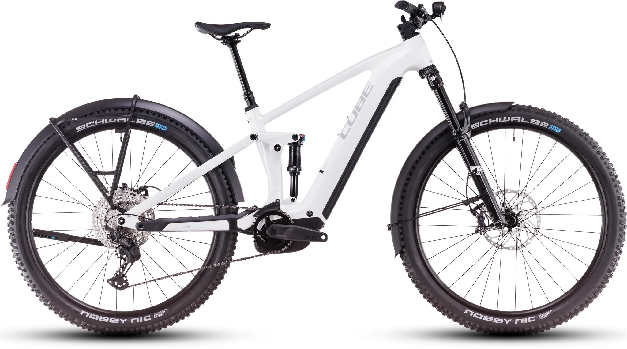 Cube Stereo Hybrid ONE44 EXC 800 Allroad white 2025 Ein Bike, das alles kann und alles mitmacht, ist das Stereo Hybrid ONE44 EXC 800 Allroad, das standardmäßig mit Schutzblechen, Gepäckträger und Lichtanlage daherkommt. So macht es auf dem täglichen Weg ins Office einen ebenso guten Job wie als klassischer Tourer und potenter Bikepacker auf längeren Reisen. Doch da ist noch mehr: Seine Allround-Offroad-Qualitäten verdankt das Fully den 140 mm Federweg der Fox 36 AWL Float Federgabel und des Float Rhythm RC Dämpfers. Ein zuverlässiges und top kontrolliertes Fahrgefühl vermitteln die griffigen Schwalbe Nobby Nic 2.6 Zoll Pneus und kraftvoll zupackenden hydraulischen XT Scheibenbremsen von Shimano. Last, but not least liefern die bis zu 85 Nm Drehmoment des Bosch CX Motors samt 800 Wh PowerTube Akku starke Unterstützung im Vorwärts – und damit jede Menge Fahrspaß auf Tour. Diese Power wohldosiert auf den Boden bringt die enorm breit gefächerte Shimano XT 12-fach Schaltung.