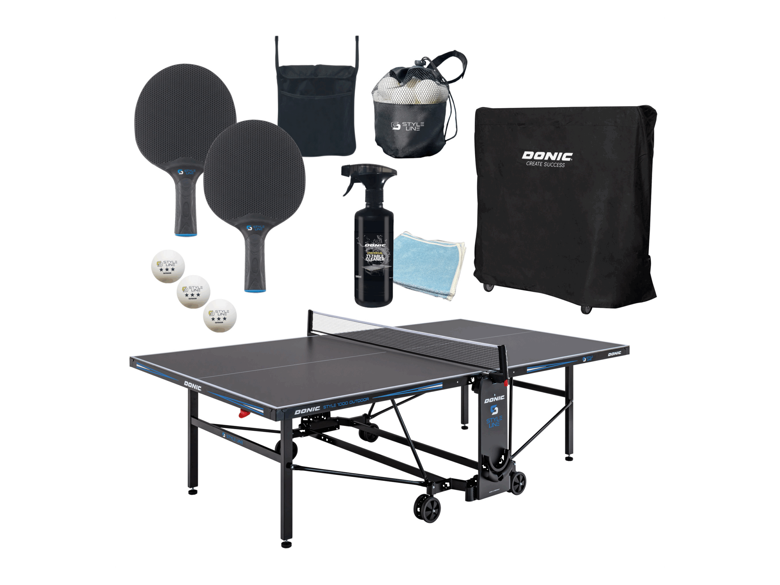 Donic Tischtennis-Set Style 1000 Outdoor, inkl. Zubehör Mit dem umfangreichen Donic Style 1000 Tischtennisplatten-Set hast du alles was du benötigst; um sofort mit dem Tischtennis spielen zu starten. Das Donic Tischtennisset Style 1000 Outdoor besteht aus einer wetterfesten Tischtennisplatte mit hochwertiger Sonderausstattung, zwei Style 1000 Outdoor-Tischtennisschlägern; einem Style-Line Ballset mit 32 Outdoor-Tischtennisbällen inklusive Ballkorb zur Befestigung an der Tischtennisplatte und einer schwarzen Abdeckhülle zum Schutz der Tischtennisplatten vor Witterungseinflüssen. Ebenfalls enthalten ist ab sofort auch ein Universal-Tischtennisplatten-Reiniger inklusive Pflegetuch zur Reinigung der Tischoberfläche. Sämtliche dem Set zugehörigen Produkte sind sowohl Indoor- als auch Outdoor einsetzbar und wurden in Sachen Design aufeinander abgestimmt. Design trifft Funktionalität DIE Donic Style Line steht für höchste Qualitäts- und Funktionsansprüche kombiniert mit einem herausragenden Design. Die farblichen Akzente im Bereich des Rahmens und die gewählten Logo Prints wurden perfekt auf die graue Oberfläche abgestimmt und bilden so ein harmonisches Gesamtkonzept. Die Outdoor-STYLE Line 1000 wurde mit einem eigens entwickelten Farbdesign versehen. Die Kombination aus schwarzem Rahmen, grauer Oberfläche und blauen Highlights, geben dem Style-1000 Modell einen unverwechselbaren Charakter. Technologie auf höchstem Level Der Donic Style 1000 Outdoor ist eine Premium Outdoor-Tischtennisplatte, die von Profis für Freizeitspieler entwickelt wurde. Gefertigt unter höchstem Produktionsstandards in Deutschland lag das Hauptaugenmerk der Entwicklung einer wetterfesten Tischoberfläche; die perfekte Spieleigenschaften und insbesondere einen gleichmäßigen Ballabsprung gewährleistet. Mit der “Melamin-Surface Technology” wurde hierzu ein Verfahren, eingesetzt, bei dem mehrere Schichtmaterialien und Melaminharz unter hoher Temperatur gepresst werden. Neben den hervorragenden Spieleigenschaften bewirkt dies eine erhöhte Schlagfestigkeit, Feuchtigkeitsressistenz und Langlebigkeit der anthrazitfarbenen 6mm starken Spezialoberfläche. Wetterfestigkeit – Stabilität – Mobilität Das 50 mm dicke pulverbeschichtete Mettall-Rahmenprofil (Longtime Surface Coating) mit auffälligen Style-Line Applikationen und das Vierkantrohrprofil mit 50 x 30 mm geben dem der Tischtennisplatte die nötige Robustheit und Stabilität. Die hochwertige Kippsicherung mit automatischem Einrastmechanismus (Double Lock System) auf beiden Seiten des Tisches verhindert beim Auf- und Abbau das Umkippen und begünstigt zudem ein schnelles Hoch- und Runterklappen der Tischhälften. Aufgrund der vier gummierten Doppelleichtlaufrollen mit 128mm Durchmesser sind Positionswechsel auch im unebenen Gelände kein Problem. Sonderausstattung Der platzsparende und kompakte Donic Style 1000 Outdoor verfügt über eine Premium-Sonderausstattung. Ein inkludiertes Höhen- und Spannungsverstellbares Outdoor-Tischtennisnetz und die seitlich angebrachte Schläger- und Ballhalterung in Style Line Optik, mit Platz für 4 Tischtennisschläger und 10 Tischtennisbällen überzeugen auf ganzer Linie. Das einseitige Hochklappen der Tischoberfläche in den Single Player Modus ist ebenfalls möglich. Abgerundet wird die Ausstattung mit den an den Tischbeinen befindlichen Höhenverstellern zum Ausgleich von Unebenheiten des Unterbodens im Garten. Produktmerkmale table{width:100%;}td{padding-right: 30px; padding: 0.5rem; border-bottom: 0.0625rem solid #e3e4e5;} tr:nth-child(odd) {background-color: #F2F3F4;} Aufstellmaß: 274 x 152,5 x 76 cm Verstaumaß: 152,5 x 69,5 x 155 cm Einsatzbereich: Outdoor Wetterfest: ja Max. Belastung: 250 kg Klappmechanismus: ja Höhenverstellbar: ja Gewicht: 70 kg Lieferumfang: 1 x Tischtennisplatte, 1 x Outdoor-Tischtennisnetz , 1 x Ball- Schlägerhalterung , 1 x Montageanleitung, 2 x Tischtennisschläger Outdoor, 1 x Tischabdeckhülle; 32x Tischtennisbälle im Outdoor-Ballset mit Korbtasche, Universal-Tischreiniger inkl.Pflegetuch Hinweis: Die Lieferung des Sets umfasst zwei Packstücke; die zeitlich unabhängig voneinander zugestellt werden