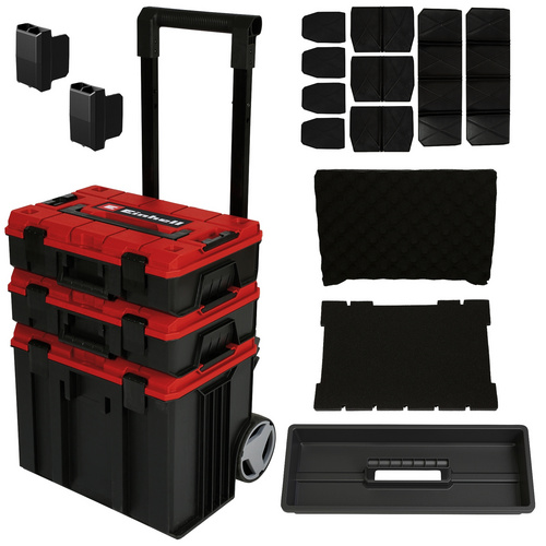 Marke: EINHELL · Farbe: rot, schwarz · Einsatzbereich: innen & außen · Gewicht: 10,08 kg · Serienname: Einhell Accessory · Anzahl Rollen: 2 Technische Daten · Belastung pro Fach: 120 kg · Tragfähigkeit (max.): 120 kgMaßangaben · Höhe: 67,5 cm · Länge: 43 cm · Breite: 40 cmMaterialangaben · Material: Kunststoff Funktionen & Ausstattung · Abschließbar: Nein Hinweise · Aufbau: fertig montiert Lieferung · Lieferumfang: 1x E-Case L mit Rädern, 1x E-Case S-F, 1x E-Case S-C, 1x Einlage Handwerkzeug, 1x Trennwände (2x groß, 3x mittel, 4x klein), 1x Schaumstoffeinlage, 3x Beschriftungsaufkleber, 2x Abstandshalter · Anzahl Teile: 19