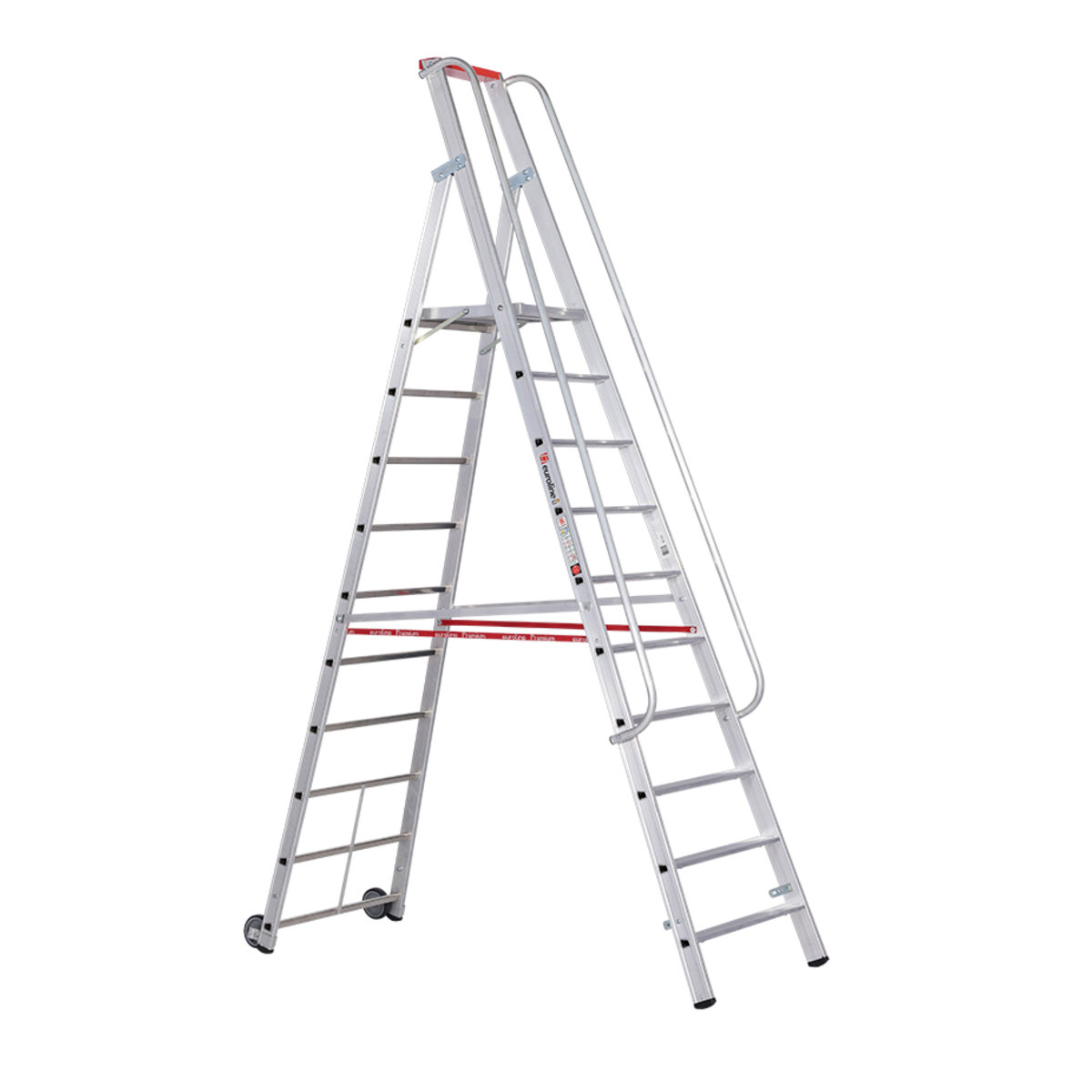 Alu-Stufenstehleiter fahrbar mit großer Standplattform mit R13 Rutschhemmung und 10 Stufeneuroline – der sichere AufstiegDiese einseitig begehbare Stufenstehleiter verfügt über eine große Standplattform und macht so längeres Stehen auf der Leiter sehr angenehm und sicher auch mit schweren Geräten. Sie kann sowohl im Lager, als auch für Handwerksarbeiten aller Art genutzt werden. Aber auch beim Hecke schneiden oder Wohnwagen waschen kann sie zum Einsatz kommen. Durch die 2 Rollen kann sie einfach und schnell zwischen den Arbeitseinsätzen verschoben werden. Die beidseitigen Handläufe erhöhen die Sicherheit sowohl auf den Stufen, als auch auf der Plattform. Die Leiter entspricht der neuen TRBS 2121-2 (Technische Regeln für Betriebssicherheit).Inklusive 2 Handläufe zum SelbstanbauGroße Standplattform 480 x 415 mm mit R13 Rutschhemmung für bequemes und sicheres Stehen2 Rollen (⌀ …
