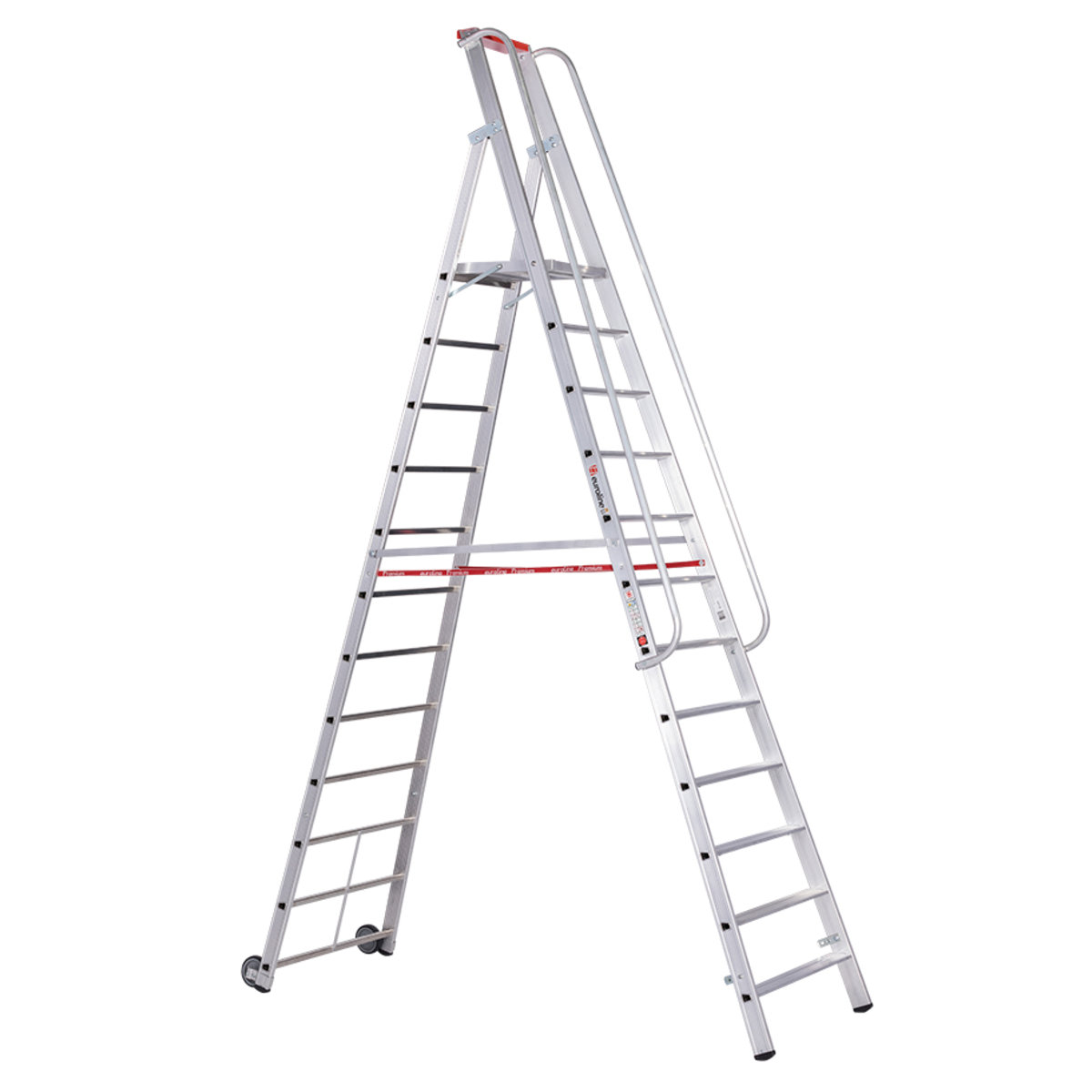 Alu-Stufenstehleiter fahrbar mit großer Standplattform mit R13 Rutschhemmung und 12 Stufeneuroline – der sichere AufstiegDiese einseitig begehbare Stufenstehleiter verfügt über eine große Standplattform und macht so längeres Stehen auf der Leiter sehr angenehm und sicher auch mit schweren Geräten. Sie kann sowohl im Lager, als auch für Handwerksarbeiten aller Art genutzt werden. Aber auch beim Hecke schneiden oder Wohnwagen waschen kann sie zum Einsatz kommen. Durch die 2 Rollen kann sie einfach und schnell zwischen den Arbeitseinsätzen verschoben werden. Die beidseitigen Handläufe erhöhen die Sicherheit sowohl auf den Stufen, als auch auf der Plattform. Die Leiter entspricht der neuen TRBS 2121-2 (Technische Regeln für Betriebssicherheit).Inklusive 2 Handläufe zum SelbstanbauGroße Standplattform 480 x 415 mm mit R13 Rutschhemmung für bequemes und sicheres Stehen2 Rollen (⌀ 125mm…