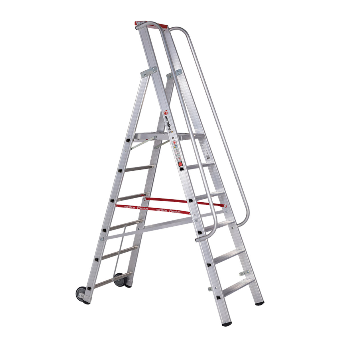 Alu-Stufenstehleiter fahrbar mit großer Standplattform mit R13 Rutschhemmung und 6 Stufeneuroline – der sichere AufstiegDiese einseitig begehbare Stufenstehleiter verfügt über eine großeStandplattform und macht so längeres Stehen auf der Leiter sehr angenehmund sicher auch mit schweren Geräten. Sie kann sowohl im Lager, alsauch für Handwerksarbeiten aller Art genutzt werden. Aber auch beimHecke schneiden oder Wohnwagen waschen kann sie zum Einsatz kommen.Durch die 2 Rollen kann sie einfach und schnell zwischen denArbeitseinsätzen verschoben werden. Die beidseitigen Handläufe erhöhendie Sicherheit sowohl auf den Stufen, als auch auf der Plattform. DieLeiter entspricht der neuen TRBS 2121-2 (Technische Regeln fürBetriebssicherheit).Inklusive 2 Handläufe zum SelbstanbauGroße Standplattform 480 x 415 mm mit R13 Rutschhemmung für bequemes und sicheres Stehen2 Rollen (⌀ 125mm) zum einf…