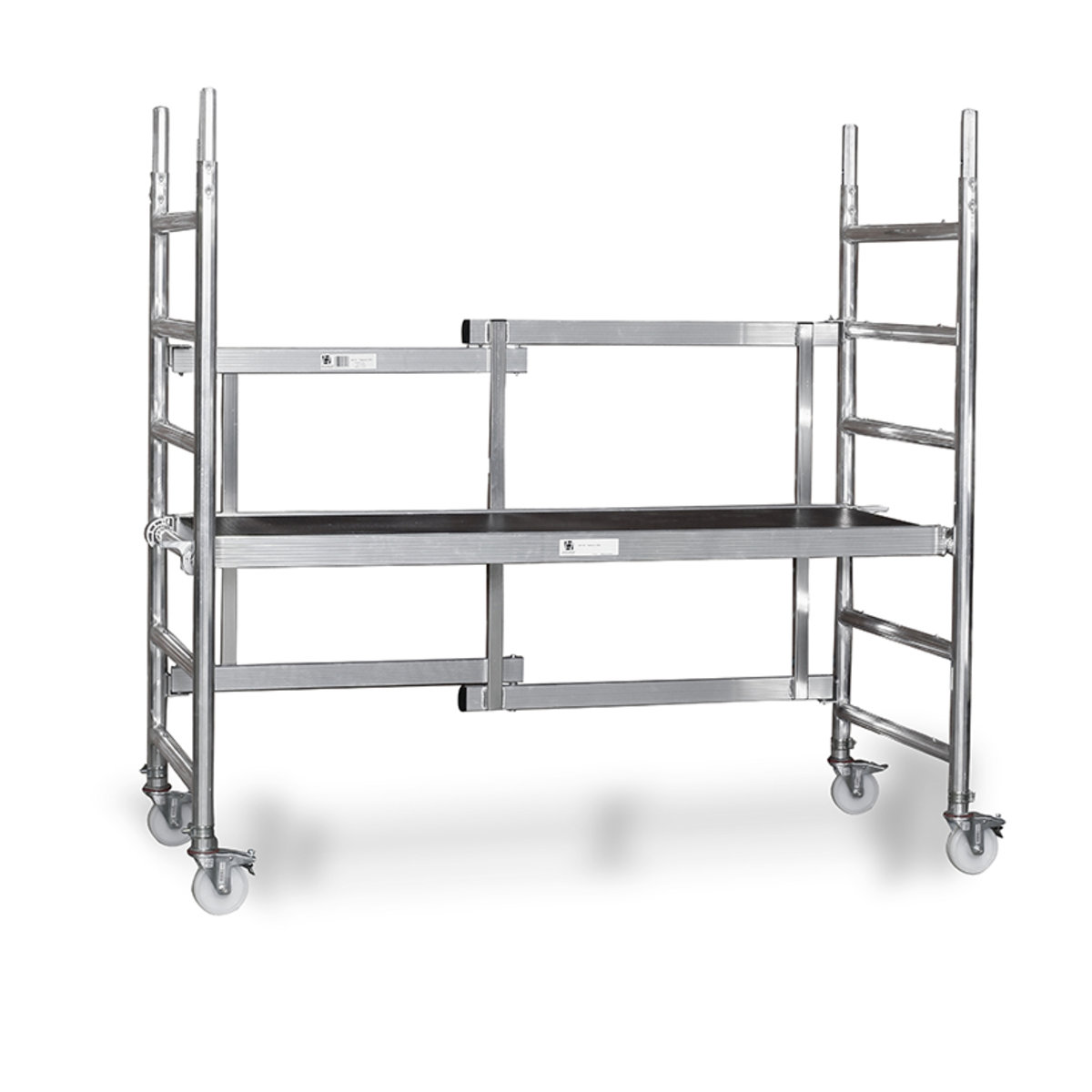 Platzsparendes und stabiles Faltgerüst mit Gelenkträger – geeignet für Arbeiten im Innenraum und im Freieneuroline – der sichere Aufstieg Korrosionsbeständiges, leichtes Gerüst mit Rollen Platzsparend klappbar Wandstärke der Standrohre beträgt 2,7 mm – dadurch langlebig und stabil Zulässige Belastung: 2 kN/m² (200 kg/m²) gemäß Gerüstgruppe 3 Die Arbeitshöhe von bis zu 2,85 m lässt sich durch zusätzlich erhältliche Geländeraufbauten auf bis zu 3,60 m erweitern Schneller und einfacher Aufbau ohne Werkzeug Lieferumfang:2x Rahmen mit 6 Sprossen, Breite 0,75 m1x Plattform 1,80 m1x Gelenkträger 1,80 m4x Lenkrolle mit Zapfen Ø = 125mm4x Federsteckereuroline bietet eine Variantenvielzahl von platzsparenden und stabilen Faltgerüsten für verschiedene Anwendungsfälle und Zielgruppen, welche für den professionellen Einsatz entwickelt wurden. Durch zusätzliche Gelände…