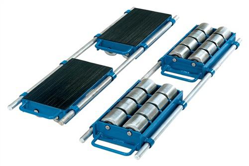 Fahrwerk verstellb.Trgf.24 t 16 Lastrollen · verstellbar · stabile Stahl- Schweißkonstruktion, pulverbeschichtet, brillantblau, RAL 5007 · Tragplatten mit rutschhemmender Gummiauflage · große kugelgelagerte Nylonrollen · ab 24 t mit kugelgelagerten