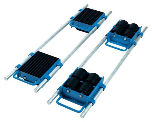 Fahrwerk verstellb.Trgf.6 t 8 Lastrollen · verstellbar · stabile Stahl- Schweißkonstruktion, pulverbeschichtet, brillantblau, RAL 5007 · Tragplatten mit rutschhemmender Gummiauflage · große kugelgelagerte Nylonrollen · ab 24 t mit kugelgelagerten