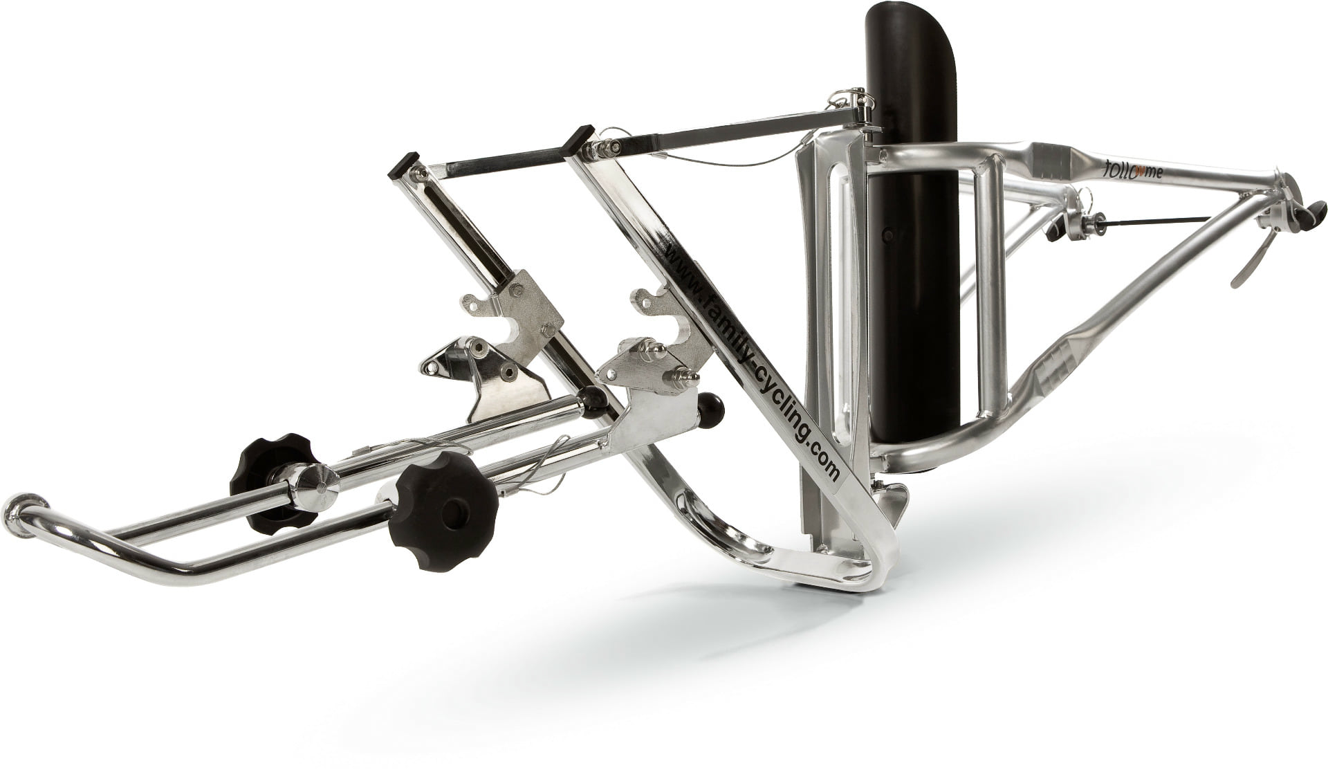 FOLLOWME Tandem Komplett-SetSelbst fahren oder gezogen werden – ist das Motto von FollowMe! Es erlaubt Ihnen, das Kind sicher durch den Strassenverkehr zu bringen und es abseits vom gefährlichen Verkehr alleine fahren zu lassen. Und wenn es müde ist, koppeln Sie es einfach wieder an. So sind Sie sicher unterwegs, kommen immer ans Ziel und die Kinder werden langsam ans Radfahren und den Verkehr herangeführt. Montage: In einmaliger Montage bereiten Sie Kinder- und Erwachsenenrad vor und montieren Nabe und Halterungen. Am Elternrad mittels Schnellspanner oder entsprechenden Achsadaptern, am Kinderrad mit einer Klammer am Unterrohr. Diese passt auf alle Rohre und Formen. Danach verbinden Sie mit der FollowMe-Kupplung ein Kinderrad im Handumdrehen – und werkzeugfrei – fest mit Ihrem Erwachsenenrad. Dabei stören weder Kinderanhängerkupplung noch Fahrradständer.FollowMe verstauen: Nach Gebrauch, wenn kein Kind angedockt ist, FollowMe einklappen und am Gepäckträger oder Sattel mittels Karabinerhaken aufhängen. Für Fahrten ohne Kinder ist die komplette FollowMe Kupplung im Nu vom Zugfahrrad entfernt.Die Vorteile von FollowMe: Zusammen unterwegs: Mit FollowMe transportieren Sie uneingeschränkt einen zweiten Kindersitz oder Ihren Einkauf auf dem Gepäckträger.Schnell montiert: In Sekundenschnelle – ohne Werkzeug oder Montageteilen – haben Sie Ihr Kind mit ein paar Handgriffen angedockt.Sicher und stabil: Die Zweipunkteaufhängung auf Nabenhöhe bietet Ihnen Sicherheit, Fahrkomfort und Stabilität, da keine Hebel wirken wie bei herkömmlichen Fixierungen am Sattelrohr.Platzsparend: Das FollowMe ist schnell und platzsparend verstaut – am Auto, im Farradkeller oder in der Bahn.Das FollowMe wächst mit! Kind und Rad werden grösser – kein Problem mit FollowMe.Technische Details: Kinderrad: Für alle gängigen Grössen von 12-20″ (Alter 3– 9 Jahre). Erwachsenenrad: Für alle 26″ und 28″ City-, Mountain- (auch Fullies), Renn- und Tourenräder usw. mit Schnellspanner-Radbefestigung. Für Räder mit Vollachse oder Radnabenschaltung sind entsprechende Adapter erhältlich.Material: Stahl, pulverbeschichtet / verchromtGewicht: 4 kgZuggewicht: TÜV geprüft bis 45 kgZusatzbeladung: Kindersitz, Gepäckträger und Seitentaschen uneingeschränkt möglich.Zusatzteile – Nicht im Lieferumfang enthalten: Zusätzliches Montage-Set zum Einrichten eines weiteren Erwachsen- oder Kinderfahrrades sind erhältlich.Adapter: Im Lieferumfang enthalten:-für das Erwachsenenrad: Schnellspanner-Adapter.-für das Kinderrad jeweils ein Adapterset: 5/16 x 26G, 3/8 x 26G, M9 x1.