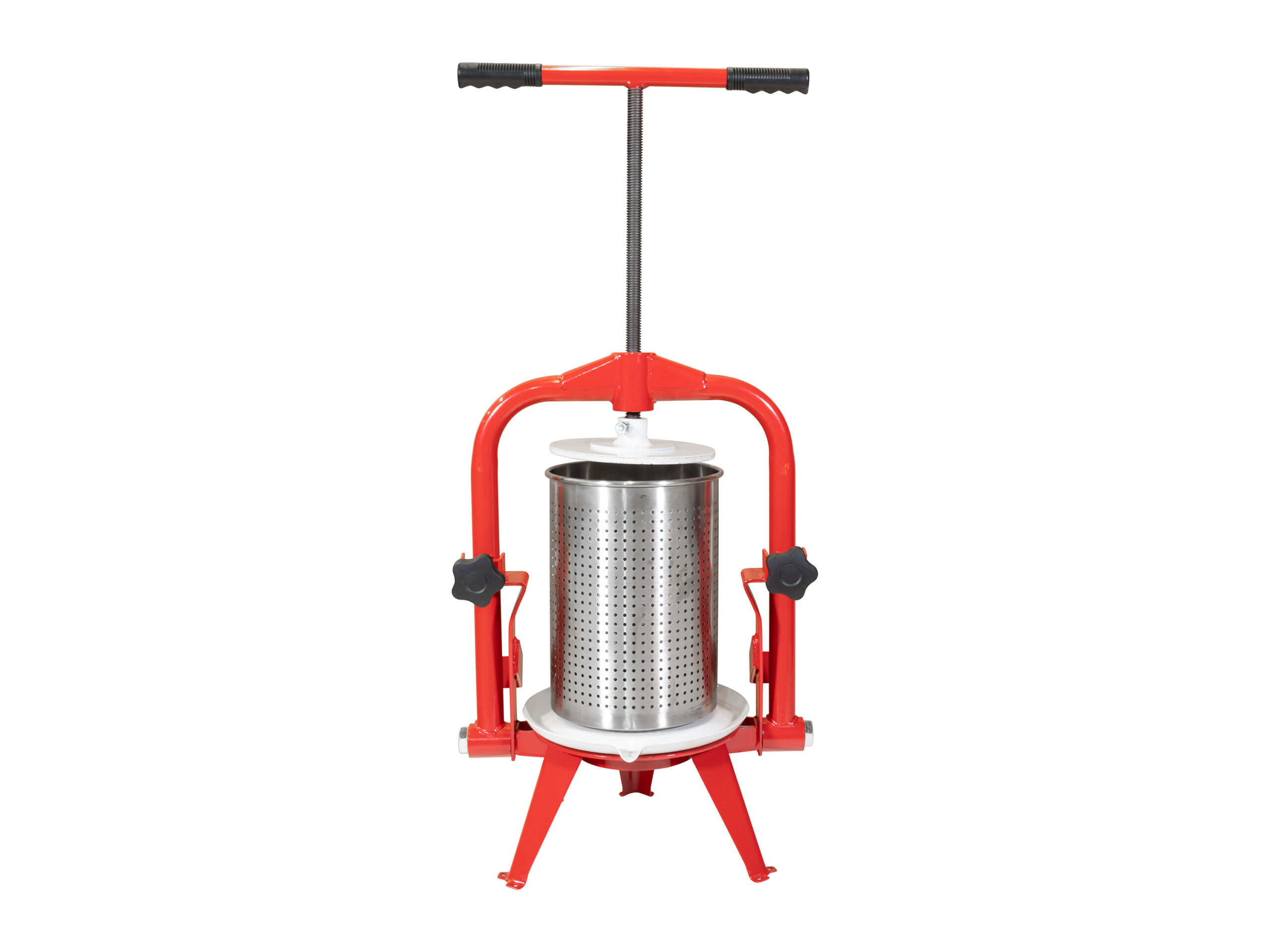 Becken mit lebensmittelechter Farbe lackiert Komplett montiert 6, 12, 18 und 30 Liter: Unbehandeltes Holz Presstuch aus strapazierfähigem Polyester 9 und 14 Liter: Presskorb aus gelochtem Edelstahl Dreh-und abnehmbare Auffangschale Massiver Stahlrahmen Schwenkbares Druckwerk zum besseren Befüllen Einfaches Reinigen durch herausnehmbaren Edelstahl-Presskorb Maße 6 Liter: Gesamthöhe: 565 mm Presskorb: 6 Liter (H 260 mm, Ø 195 mm) Auffangbecken: Ø 275 mm 9 Liter: Gesamthöhe: 640 mm Presskorb: 9 Liter (H 280 mm, Ø 200 mm) Auffangbecken: Ø 270 mm 12 Liter: Gesamthöhe: 580 mm Presskorb: 12 Liter (H 270 mm, Ø 265 mm) Auffangbecken: Ø 370 mm 14 Liter: Gesamthöhe: 740 mm Presskorb: 14 Liter (H 280 mm, Ø 250 mm) Auffangbecken: Ø 370 mm 18 Liter: Gesamthöhe: 695 mm Presskorb: 18 Liter (H 365 mm, Ø 285 mm) Auffangbecken: Ø 370 mm 30 Liter: Gesamthöhe: 870 mm Presskorb: 30 Liter (Ø 270 mm) Auffangbecken: Ø 370 mm Gewicht 6 Liter: 6,3 kg 9 Liter: 13,7 kg 12 Liter: 9,9 kg 14 Liter: 20,2 kg 18 Liter: 12,4 kg 30 Liter: 15,0 kg