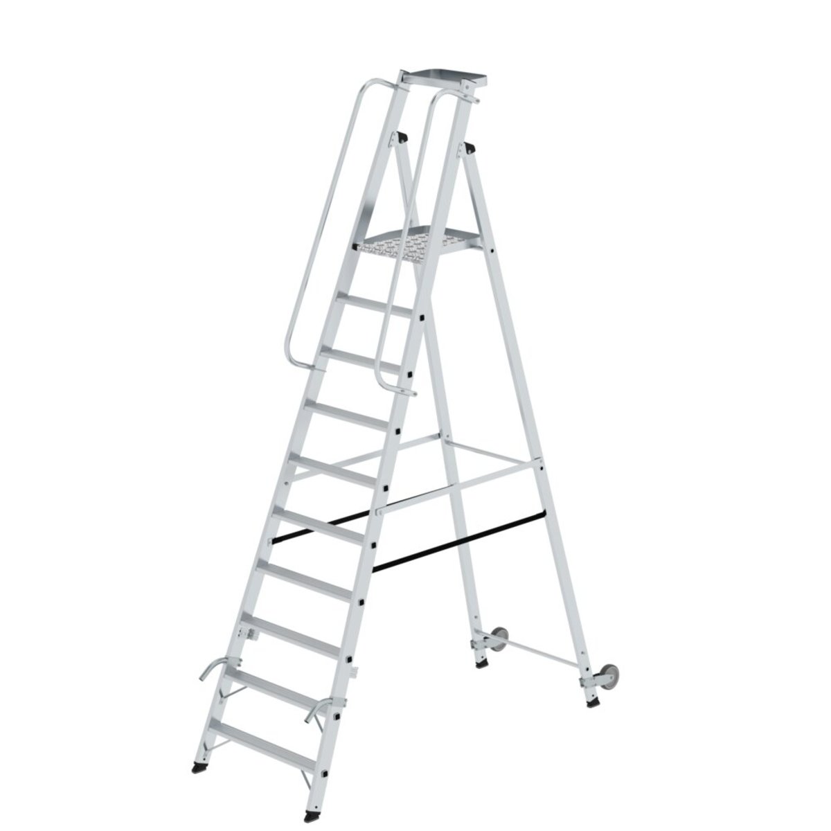 Plattformleiter aus Aluminium Stabile Rechteckrohr-Holme 80 mm tiefe, geriffelte Stufen Große, trapezförmige Plattform (400 / 360 x 425 mm) 4-fach gebördelte Stufen-/Holmverbindung Konische Holmführung für einen sicheren Stand Zwei Handläufe für sicheren Auf- und Abstieg (liegen lose bei) Leitergelenk ‘safe-cap’ nivello® Leiterschuhe mit patentierter 2-Achsen-Neigungstechnik Praktische Ablageschale (350 x 200 mm) Starre Verbindung durch beidseitig lösbare Metallstreben Spreizsicherung mit zwei hochfesten Polyestergurten Zwei Hubrollen Ø 125 mm und Handgriffe (liegen lose bei) Stufenabstand: 235 mm Leiterneigung: 70° Maximale Belastung: 150 kgInformationen zu Nachhaltigkeitskriterien Unternehmenszertifizierung: ISO 9001 Unternehmenszertifizierung: EN 1090 Unternehmenszertifizierung: EcoVadis RoHS REACH Die MUNK Group arbeitet mit einem Code of Conduct Das Lieferkettengesetz findet auf…