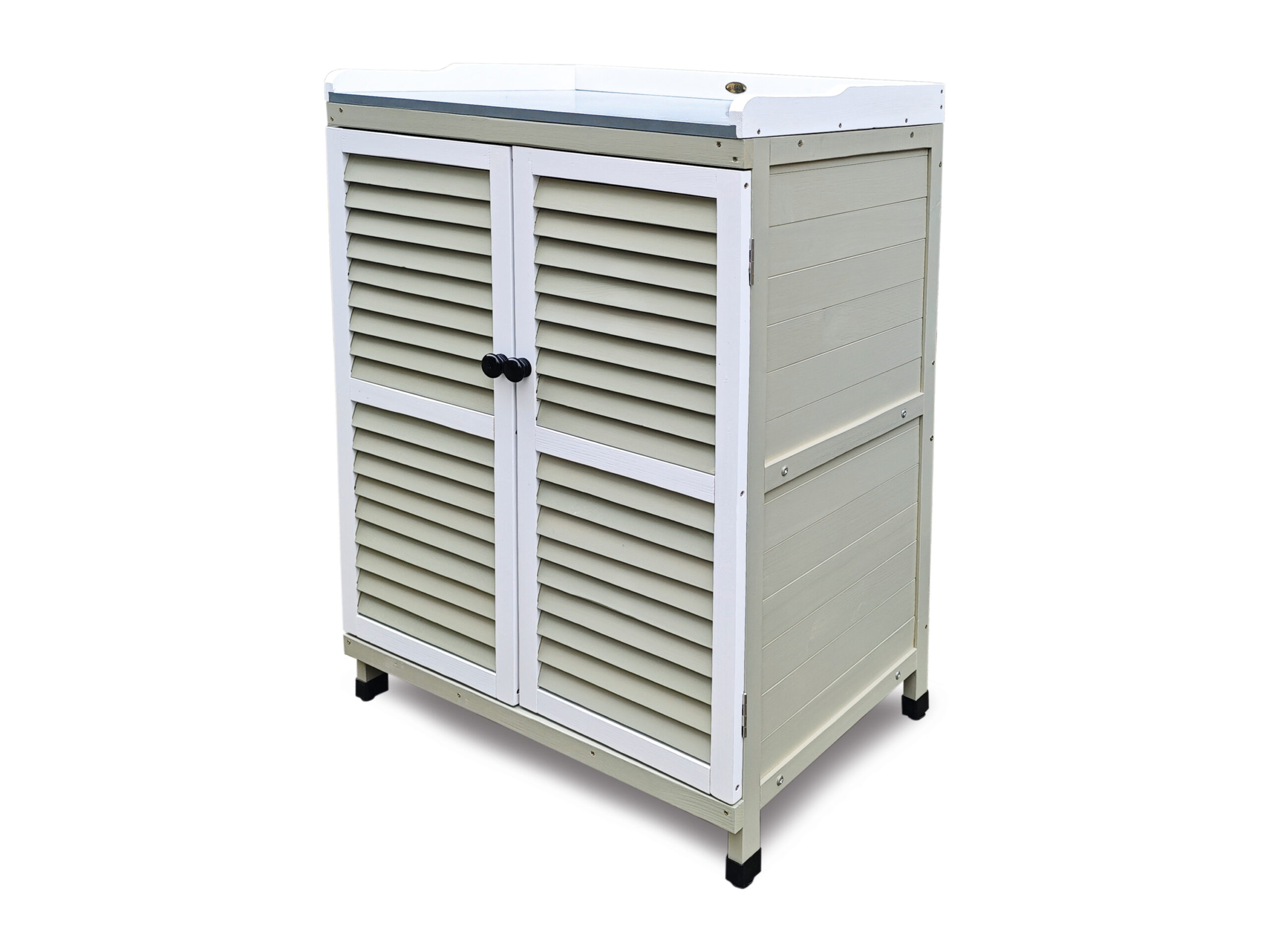 Habau Gartenschrank “Mila”; mit Arbeitsplatte, 71 x 48 x 100 cm Der Gartenschrank vereint Stauraum und Arbeitsfläche zu einem platzsparenden Gesamtkonzept. Der Schrank bietet genügend Platz für Gartengeräte; Werkzeuge oder Grillzubehör. Gleichzeitig besitzt der Gartenschrank “Mila” eine hochwertige Arbeitsplatte aus Metall, auf der Pflanzen umgetopft oder Grillgut vorbereitet werden kann. So werden Gartenschrank und Pflanztisch platzsparend und praktisch vereint. Durch seine kompakte Ausführung passt er wunderbar auf Balkone wie auf Terrassen und stellt so eine ideale Ergänzung zum Grill oder für ein Beet dar. Die Arbeitsplatte ist im Handumdrehen gereinigt: Einfach mit einem feuchten Tuch abwischen und schon ist alles wieder sauber. Der Innenraum des Schranks ist mit einem Regalboden unterteilt, sodass dieser bestmöglich ausgenutzt werden kann. Der Gartentisch wird durch Kunststoffhülsen an den Füßen vor Nässe geschützt und kann auch auf Rasenflächen aufgestellt werden. Der gesamte Schrank ist zweifarbig lasiert. Bitte beachte, dass es sich um ein Naturprodukt handelt. Der Farbverlauf kann daher je Exemplar leicht unterschiedlich sein. Bei den angegebenen Abmessungen handelt es sich um Außenmaße. Produkthighlights Mit hochwertigen Lamellentüren; zweifarbig lasiert Mit praktischer Arbeitsplatte auch als Pflanztisch oder Grilltisch nutzbar Zusätzliche Kunststoffhülsen an den Füßen schützen vor Bodennässe Einlegeboden für den Gartenschrank zur Unterteilung ist enthalten Aus FSC®-zertifizierter Fichte Produktmerkmale table{width:100%;}td{padding-right: 30px; padding: 0.5rem; border-bottom: 0.0625rem solid #e3e4e5;} tr:nth-child(odd) {background-color: #F2F3F4;} Max. Belastung: 15 kg Tischplattenstärke: 2 cm Witterungsbeständig: ja Farbe: grau-weiß Material Arbeitsfläche: Metall Material Gestell: Holz Maße: L 71 x B 48 x H 100 cm Gewicht: 18 kg Lieferumfang: Gartenschrank, Montagematerial, Montageanleitung