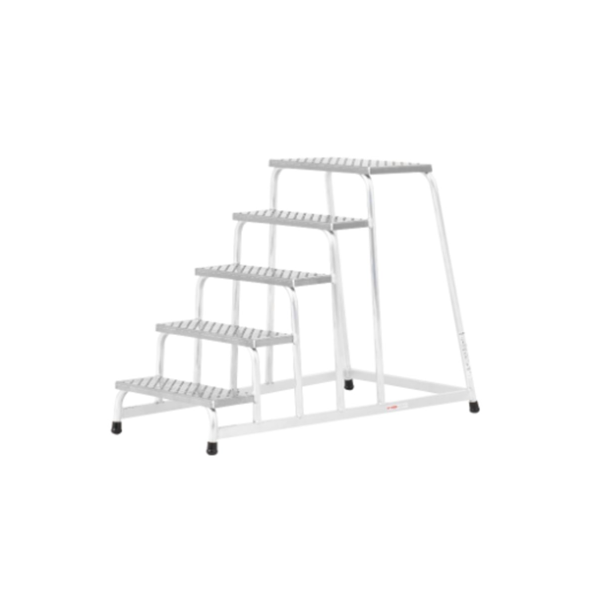Maschinentritt R13, 5 Stufen, Standhöhe 1,00 m· Arbeitssicherheit in der höchsten Rutschhemmungsklasse R13. Geeignet für den Einsatz in öligen Bereichen.· Bequemer und sicherer Stand bei längeren Arbeiten dank großflächiger Plattform.· Rutschsicherer, komfortabler Aufstieg dank großflächiger Treppenstufe.· Extrem hohe Stabilität für starke Beanspruchung.· Ergonomisches Versetzen durch leichtes Gewicht.· Optional verfahrbar mit Rollen.Merkmale:· Aluminium-Lochblech R13.· Plattformabmessung 580 x 350 mm.· Zulässige Belastung 150 kg.· Nach EN 14183.