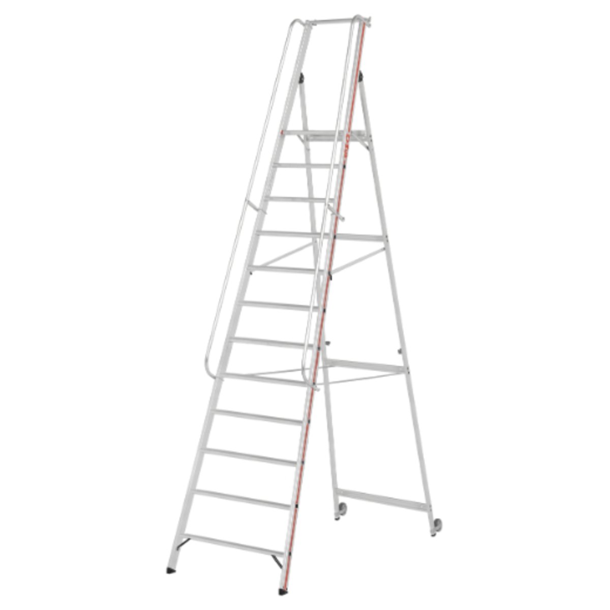 Plattformleiter mit Kipprollen und langem Handlauf, 12 Stufen, Plattformhöhe 2,80 m● Stufentiefe 80 mm.● Plattformabmessung 440×400 mm.● Geländerhöhe über Plattform 800 mm.● Ausgestattet mit Rollen am Stützteil, 100 mm Durchmesser.● Leichtes Verschieben durch Anheben am Leiterteil.● Speziell für Einsatzbereiche, die eine Verwendung von Podestleitern mit breitem Fahrwerk nicht zulassen oder das dichte Heranfahren an Regale erfordern.● Große Ablageschale für Werkzeug und Kleinteile, 450 mm breit, sowie Einhängehaken für Eimer und Kleingeräte.● Serienmäßig angebrachte, starre Streben für hohe Standsicherheit.● Stabile Aussteifungsstreben am Antritt.● Mit Gurtbändern.● Die Lieferung des Handlaufes und der Rollen erfolgt unmontiert, jedoch zur Selbstmontage vorbereitet.