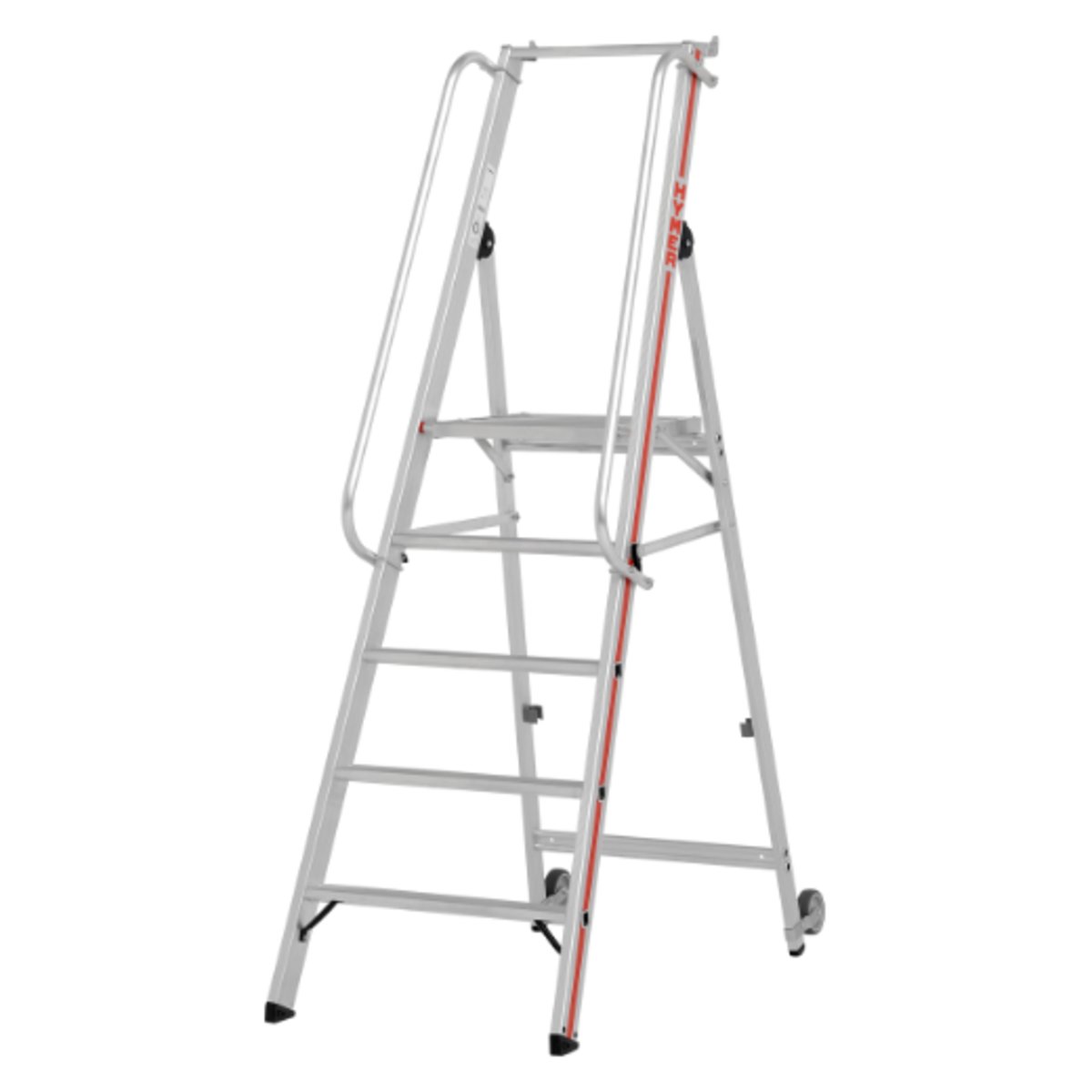 Plattformleiter mit Kipprollen und langem Handlauf, 5 Stufen, Standhöhe 1,15 m∙ Speziell für Einsatzbereiche, die eine Verwendung von Podestleitern mit breitem Fahrwerk nicht zulassen oder das dichte Heranfahren an Regale erfordern.∙ Stufentiefe 80 mm.∙ Plattformabmessung 440×400 mm.∙ Geländerhöhe über Plattform 800 mm.∙ Ausgestattet mit Rollen am Stützteil, 100 mm Durchmesser.∙ Leichtes Verschieben durch Anheben am Leiterteil.∙ Große Ablageschale für Werkzeug und Kleinteile, 450 mm breit, sowie Einhängehaken für Eimer und Kleingeräte.∙ Serienmäßig angebrachte, starre Streben für hohe Standsicherheit.∙ Die Lieferung des Handlaufes und der Rollen erfolgt unmontiert, jedoch zur Selbstmontage vorbereitet.
