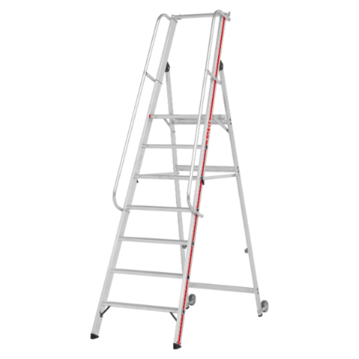 Plattformleiter mit Kipprollen und langem Handlauf, 7 Stufen, Plattformhöhe 1,65 m● Stufentiefe 80 mm.● Plattformabmessung 440×400 mm.● Geländerhöhe über Plattform 800 mm.● Ausgestattet mit Rollen am Stützteil, 100 mm Durchmesser.● Leichtes Verschieben durch Anheben am Leiterteil.● Speziell für Einsatzbereiche, die eine Verwendung von Podestleitern mit breitem Fahrwerk nicht zulassen oder das dichte Heranfahren an Regale erfordern.● Große Ablageschale für Werkzeug und Kleinteile, 450 mm breit, sowie Einhängehaken für Eimer und Kleingeräte.● Serienmäßig angebrachte, starre Streben für hohe Standsicherheit.● Stabile Aussteifungsstreben am Antritt.● Die Lieferung des Handlaufes und der Rollen erfolgt unmontiert, jedoch zur Selbstmontage vorbereitet.