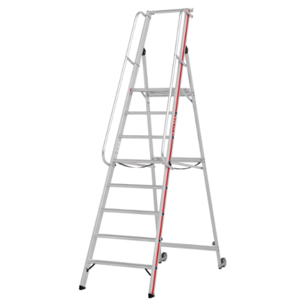 Plattformleiter mit Kipprollen und langem Handlauf, 8 Stufen, Plattformhöhe 1,85 m● Stufentiefe 80 mm.● Plattformabmessung 440×400 mm.● Geländerhöhe über Plattform 800 mm.● Ausgestattet mit Rollen am Stützteil, 100 mm Durchmesser.● Leichtes Verschieben durch Anheben am Leiterteil.● Speziell für Einsatzbereiche, die eine Verwendung von Podestleitern mit breitem Fahrwerk nicht zulassen oder das dichte Heranfahren an Regale erfordern.● Große Ablageschale für Werkzeug und Kleinteile, 450 mm breit, sowie Einhängehaken für Eimer und Kleingeräte.● Serienmäßig angebrachte, starre Streben für hohe Standsicherheit.● Stabile Aussteifungsstreben am Antritt.● Mit Gurtbändern.● Die Lieferung des Handlaufes und der Rollen erfolgt unmontiert, jedoch zur Selbstmontage vorbereitet.