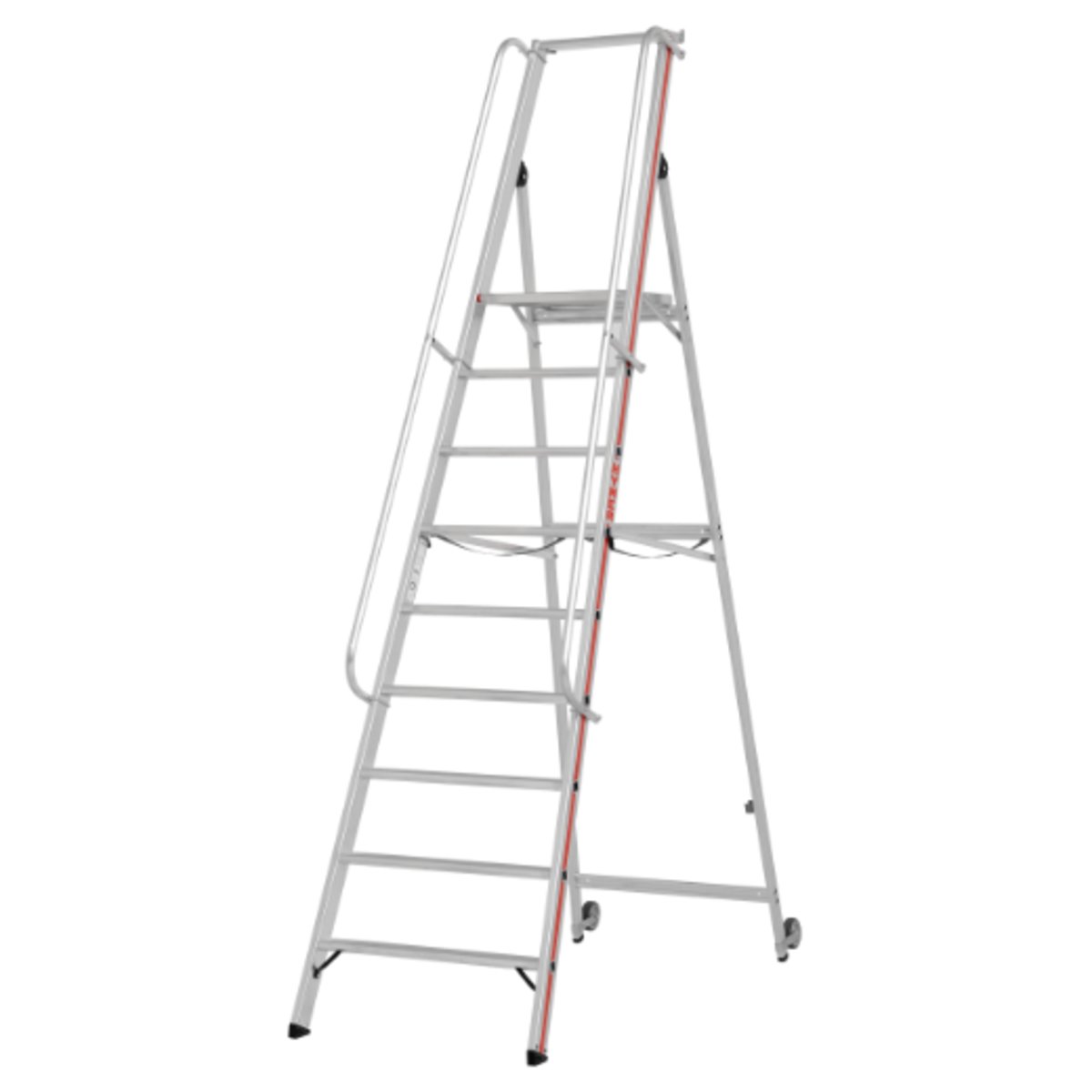 Plattformleiter mit Kipprollen und langem Handlauf, 9 Stufen, Plattformhöhe 2,10 m● Stufentiefe 80 mm.● Plattformabmessung 440×400 mm.● Geländerhöhe über Plattform 800 mm.● Ausgestattet mit Rollen am Stützteil, 100 mm Durchmesser.● Leichtes Verschieben durch Anheben am Leiterteil.● Speziell für Einsatzbereiche, die eine Verwendung von Podestleitern mit breitem Fahrwerk nicht zulassen oder das dichte Heranfahren an Regale erfordern.● Große Ablageschale für Werkzeug und Kleinteile, 450 mm breit, sowie Einhängehaken für Eimer und Kleingeräte.● Serienmäßig angebrachte, starre Streben für hohe Standsicherheit.● Stabile Aussteifungsstreben am Antritt.● Mit Gurtbändern.● Die Lieferung des Handlaufes und der Rollen erfolgt unmontiert, jedoch zur Selbstmontage vorbereitet.
