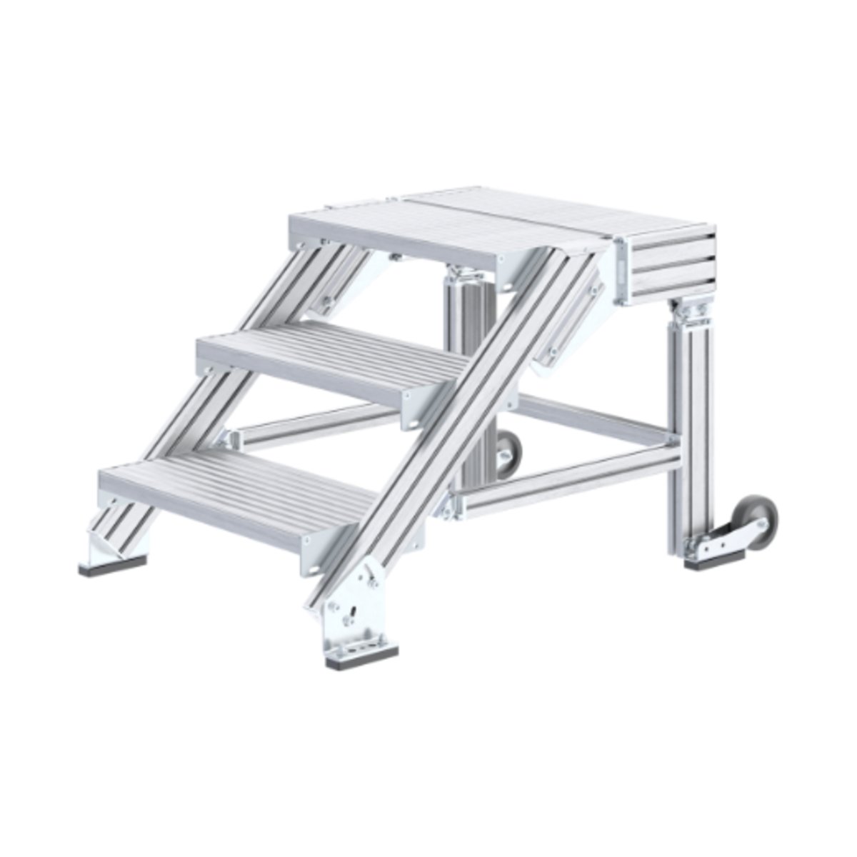 Treppenpodest, Stufenbreite 600 mm, 3 Stufen, Standhöhe 0,60 m· Bequemer und sicherer Stand bei längeren Arbeiten dank großflächiger Plattform.· Rutschsicherer, komfortabler Aufstieg dank großflächiger Treppenstufe.· Extrem hohe Stabilität für starke Beanspruchung.· Auslieferung mit 2 Rollen inkl. Befestigungsmaterial zur Selbstmontage mittels Werkzeug.· Optional: Ergonomisch geformte, beidseitige Handläufe.Merkmale:· Stufentiefe 250 mm (Alu-Profilstufen).· Stufenbreite wahlweise 600, 800 oder 1.000 mm.· Podestlänge 400 mm.· Zulässige Belastung Stufen 150 kg.· Zulässige Belastung Plattform 300 kg.· Nach EN 14183.