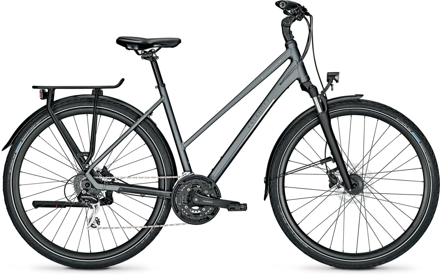Kalkhoff ENDEAVOUR 24 Ein edles Design kombiniert mit langlebigen Komponenten bietet das Kalkhoff ENDEAVOUR 24. Die 24 Gänge sorgen für eine gute Übersetzungsbreite, um auch steilere Wege zu bewältigen. Ein Gepäckträger, Schutzbleche und ein vom Nabendynamo betriebenes Licht machen dieses Rad zu einem super Begleiter im Alltag. Stellen Sie das Rad durch den verstellbaren Vorbau perfekt auf Sie ein und genießen Sie lange Radtouren ohne Beschwerden. Mit den Schwalbe Marathon Reifen sind Sie optimal für Trekkingtouren ausgerüstet – für den hauptsächlichen Gebrauch auf befestigten Wegen aber genügend Sicherheit auf kurzen Schotter und Forstwegen. Kalhoff. Schickes Design und wunderbare Alltagstauglichkeit mit dem Kalkhoff Endeavour 24!