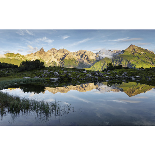 Marke: KOMAR · Farbe: bunt · Serienname: Foto Allgäu Spiegel · Glanzgrad: seidenmatt · Gewicht: 150 g/m² · Motiv: Natur · Anzahl Rollen: 1 · Tapetenart: Vliestapete · Überstreichbarkeit: Nicht überstreichbar Technische Daten · Ansatz des Musters: Gerader Ansatz · Ergiebigkeit (min.): 12,6 m² · Farbbeständigkeit: Ausgezeichnet lichtbeständig (Wert 7) Maßangaben · Länge: 280 cm · Breite: 450 cm · Stärke: 0,1 mmMaterialangaben · Oberflächenstruktur: glatt · Material: Vlies Funktionen & Ausstattung · Geeignet für Feuchtraum: Nein Hinweise · Kleisterempfehlung: Vlieskleister · Verarbeitung: Wand einkleistern · Entfernen der Tapete: Restlos trocken abziehbar · Waschbarkeit: Waschbeständig: Leichtere Verschmutzungen dürfen feucht abgewischt werden. Hierzu eignet sich ein weicher Schwamm am besten. Lieferung · Lieferumfang: Tapete, Anbringungsanleitung