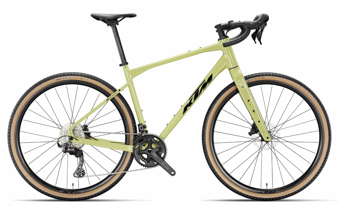 KTM Gravelator 10 – Keen Green Das KTM Gravelator 10 in der Farbe Keen Green vereint moderne Gravel-Technik, sportliches Design und Vielseitigkeit für Abenteuer abseits befestigter Straßen. Der leichte Aluminiumrahmen wird durch eine hochwertige Carbon-Gabel ergänzt, die für Komfort und Steifigkeit sorgt. Für präzises Schalten sorgt die neue Shimano GRX RX820 2×12-fach Schaltung mit großem Übersetzungsbereich. In Kombination mit dem Shimano HG710-12 Ritzelpaket (11-36) und dem RX610 Kurbelset (46/30) ist dieses Gravelbike optimal ausgestattet für lange Touren, anspruchsvolle Anstiege und schnelle Abfahrten. Zuverlässige Shimano RT30 Scheibenbremsen garantieren Sicherheit bei jedem Wetter. Breite Maxxis Reaver EXO Reifen in 45 mm bieten maximalen Grip und Fahrkomfort auf Schotter, Waldwegen und Asphalt. Der ergonomische KTM COMP II Road Lenker mit KTM Tape, die Selle Royal SRX Sattel und die KTM TEAM II Sattelstütze runden das Setup ab. Mit einem Gewicht von nur 11,2 kg ist das Gravelator 10 ein echter Allrounder für Abenteuer und Training. Rahmen: Aluminium AL6061 TB/R5070/UDH Gabel: Gravel Carbon Fork F17 Antrieb: Shimano GRX RX820 2×12-fach Kassette: Shimano HG710-12, 11-36 Bremsen: Shimano RT30 CL, 160 mm Reifen: Maxxis Reaver EXO 45-622 Laufradsatz: KTM COMP Komponenten Sattel: Selle Royal SRX Gewicht: ca. 11,2 kg Farbe: Keen Green Max. Systemgewicht: 120 kg Mit dem KTM Gravelator 10 bist du für sportliche Gravel-Touren, Bikepacking-Abenteuer und schnelle Trainingseinheiten perfekt ausgestattet.Das KTM Gravelator 10 ist in den Rahmengrößen XS (49 cm), S (52 cm), M (55 cm), L (57 cm) und XL (59 cm) erhältlich.