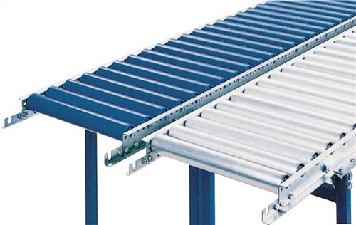 Leicht-Rollenbahnen 340mm 300mm Gerade 3m Stahlrollen 100mm · zum Transport von Stückgütern durch Schwerkraft (Gefälle) Neigung ca. 2 – 5 %, je nach Beschaffenheit und Gewicht des Fördergutes · der Boden des Fördergutes kann Längsstege oder auch umlaufende Ringleisten aufweisen, sofern diese auf den Rollen aufliegen · da die Tragrollen überstehen, kann auch überbreites Fördergut transportiert werden · abweichende Zwischenlängen sind jederzeit lieferbar · das Fördergut sollte mindestens auf 3 Tragrollen aufliegen · hieraus resultiert die erforderliche Teilung = Achsabstand · Rahmen: U-Profil 20/70/20 mm, verzinkt (Alu- oder Edelstahlprofil auf Anfrage) · Tragrollen: Kunststoffrohr Ø 50 x 2,8 mm, kugelgelagert, Stahlrohr, verzinkt Ø 50 x 1,5 mm, kugelgelagert, Aluminium- oder Edelstahlrohr auf Anfrage · Kurven: Innenradius 800 mm Tragrollen je nach Bahnbreite durchgehend bzw. mehrfach geteilt · 1 Hinweis: bei Teilung 75 mm werden geliefert: statt Länge 1000 mm – Länge 975, statt Länge 2000 mm – Länge 1950 Zusätzlich lieferbare Achsabstände: 62,5 mm, 125 mm, 150 mm und 200 mm · Weitere technische Eigenschaften Gesamtbreite: 340mm