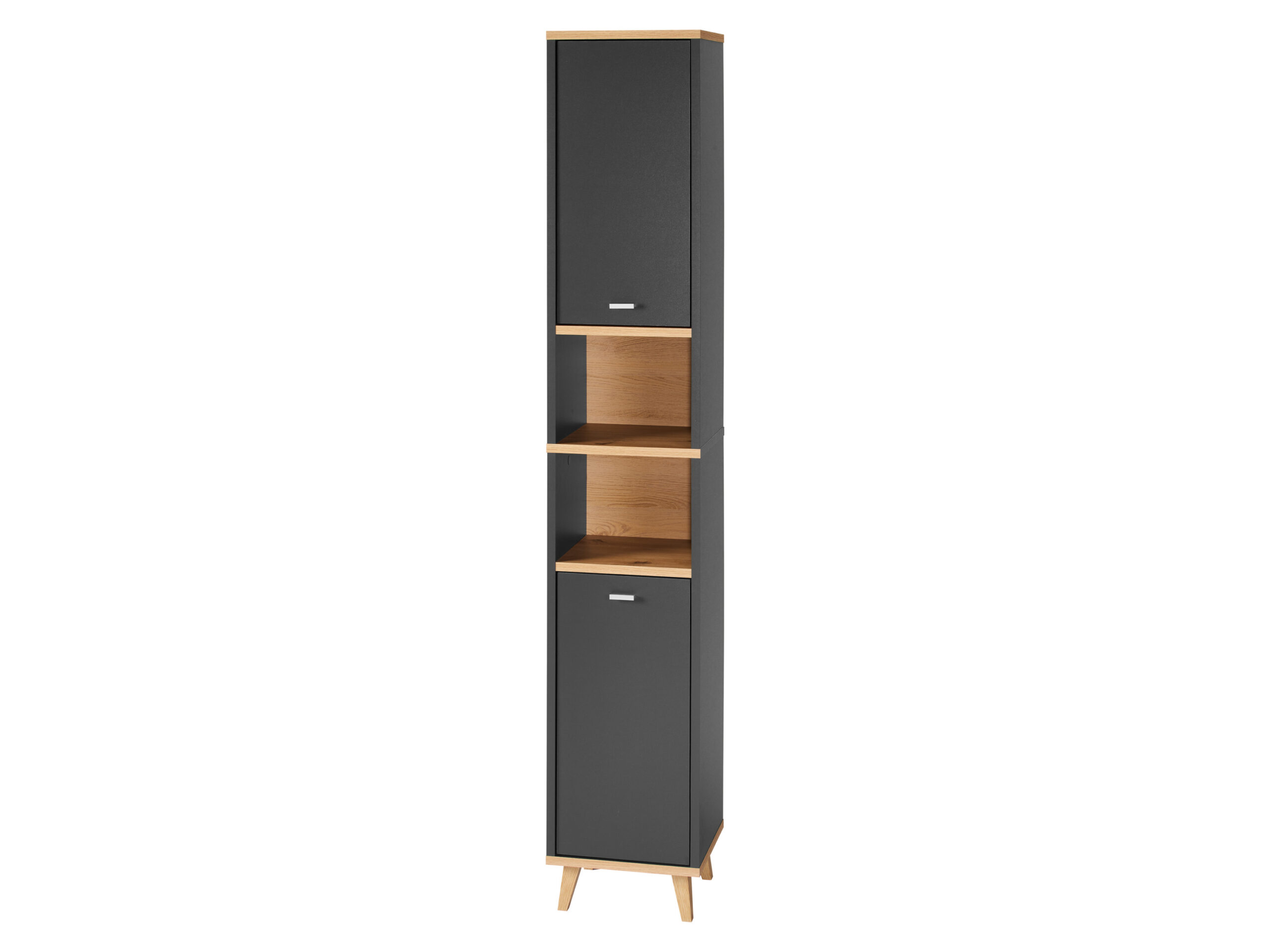 Modernes Design mit hohem Raumangebot Anthrazitfarbene Ausführung mit hochwertiger Eiche-Artisan-Nachbildung Variabler Stauraum durch höhenverstellbare Einlegeböden 2 offene Ablagefächer Kratzfest und pflegeleicht durch Melaminharzbeschichtung Türen beidseitig montierbar Griffe aus Metall Mit stabilen Standfüßen Ideal in Kombination mit weiteren Möbeln dieser Serie Produktmerkmale Style: Corfu Material: Spanplatte, Aluminium Max. Belastung: Obere Ablagefläche: 5 kg; je Fach: 3 kg Maße: ca. B 32 x H 180 x T 28 cm Gewicht: ca. 23,4 kg Lieferumfang: 1x Bad-Hochschrank, Montagematerial und Anleitung