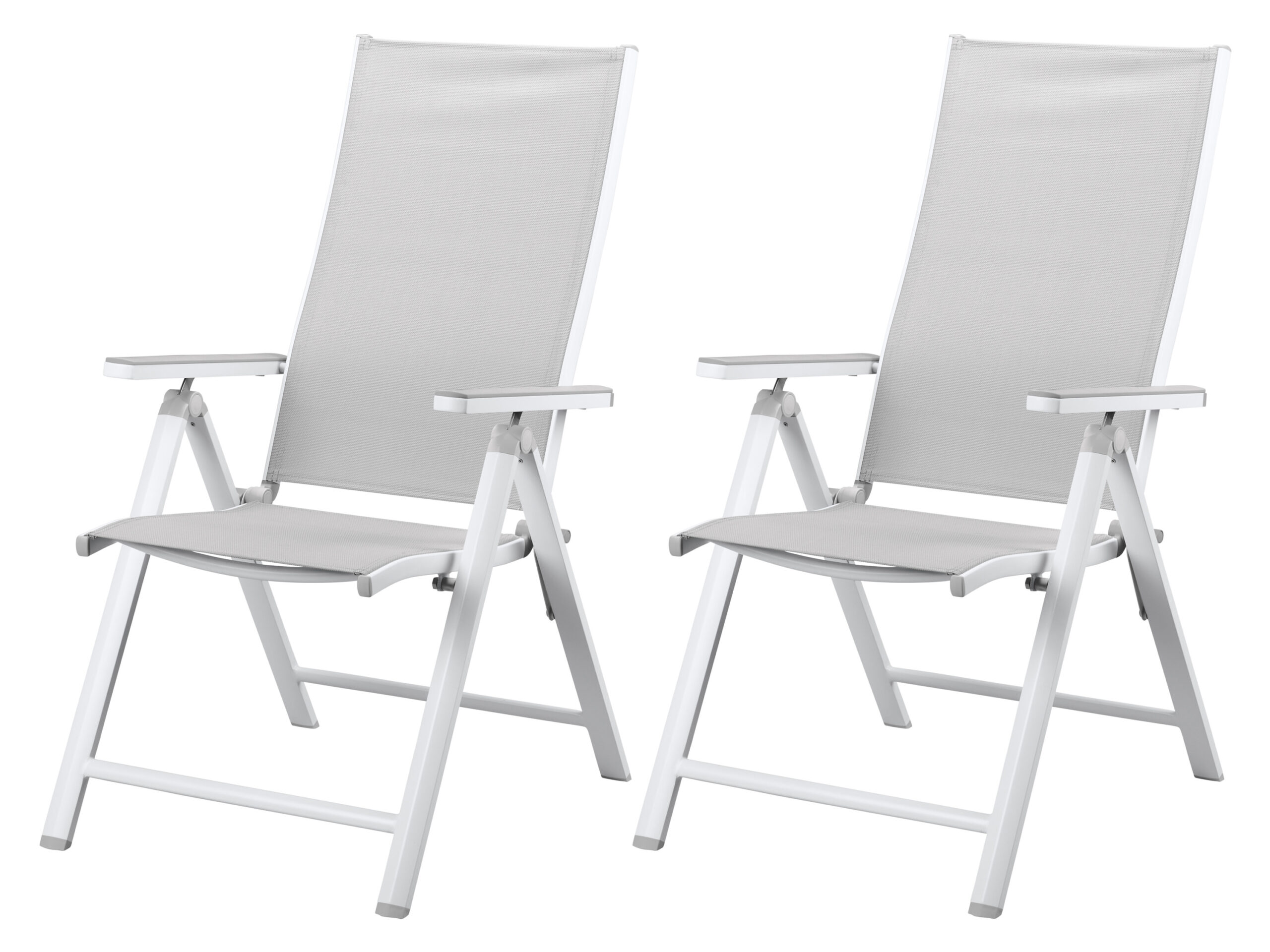 Ideal für Balkon, Garten oder Terrasse Wetterfest, UV-beständig und strapazierfähig Verstellbare Rückenlehne in 7 Positionen Pulverbeschichteter Aluminium-Leichtrahmen mit stabiler Mechanik Hoher Sitzkomfort durch angenehm tragende Textilbespannung Bequeme Armlehnen aus pflegeleichtem Kunststoff Einfach zu reinigen Platzsparend zusammenklappbar Bodenschonende und rutschhemmende Profilfüße Rostbeständig und langlebig Ideal in Kombination mit weiteren Aluminium-Möbeln von Livarno home 2 Stück Max. Belastung: ca. 120 kg Farbe: weiß/hellgrau Produktmerkmale table{width:100%;}td{padding-right: 30px; padding: 0.5rem; border-bottom: 0.0625rem solid #e3e4e5;} tr:nth-child(odd) {background-color: #F2F3F4;} Serie: Houston Funktion: verstellbare Rückenlehne in 7 Positionen, platzsparend zusammenklappbar Witterungsbeständig: ja UV-beständig: ja Material: Bezug: Textilene (70 % PVC + 30 % Polyester), Rahmen: Aluminium Max. Belastung: 120 kg Maße: ca. B 58 x H 110 x T 67 cm Gewicht: ca. 4,2 kg