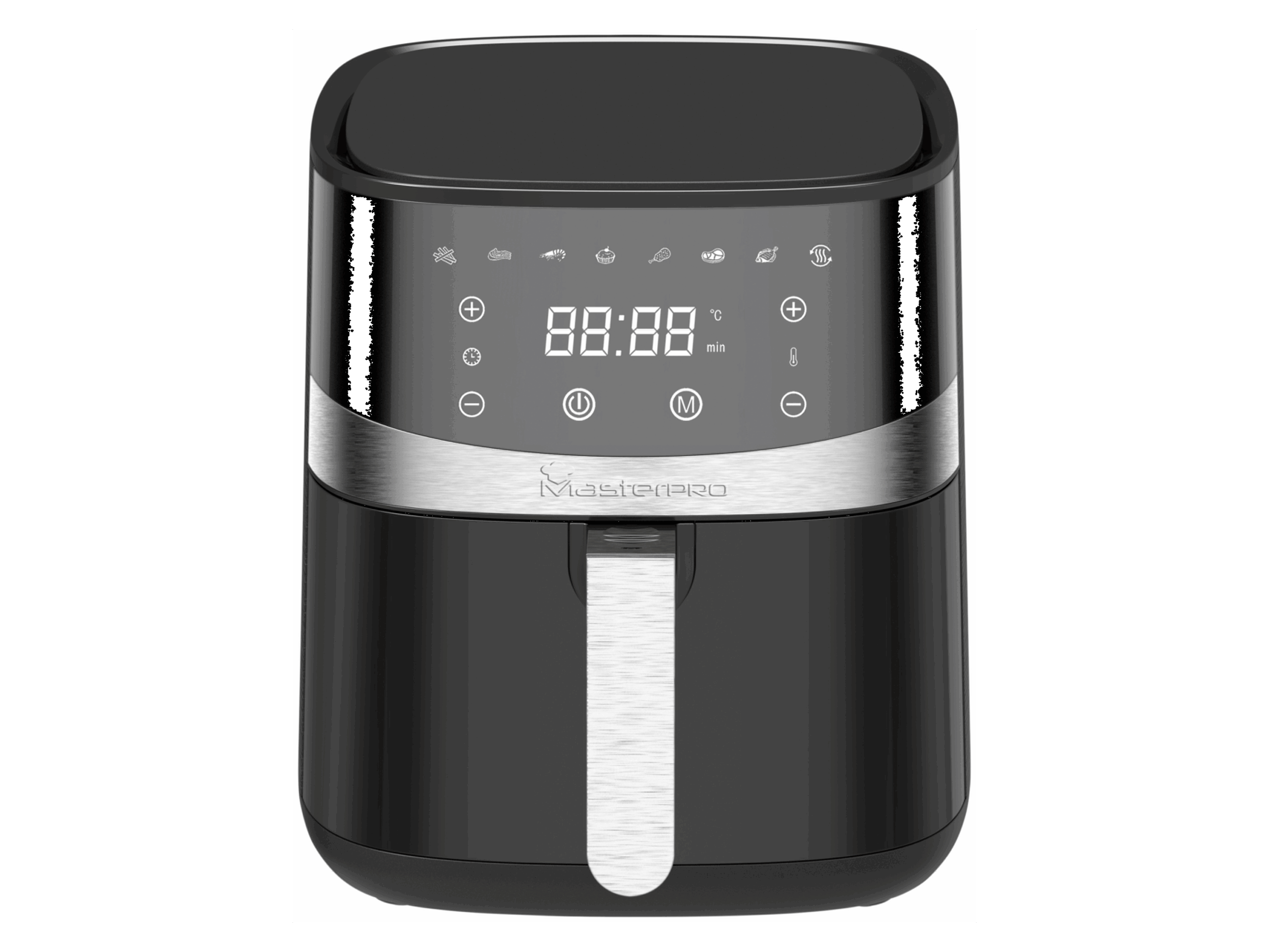 Einstellbarer Thermostat mit LED-Anzeige und -Touchscreen Herausnehmbarer Korb mit Antihaftbeschichtung Einstellbarer Timer: 0-30 Minuten 8 verschiedene Programme Antirutschfüße Überhitzungsschutz Cool-Touch Gehäuse und Griffe Korb und Gitter spülmaschinengeeignet Produktmerkmale table{width:100%;}td{padding-right: 30px; padding: 0.5rem; border-bottom: 0.0625rem solid #e3e4e5;} tr:nth-child(odd) {background-color: #F2F3F4;} Typ: Heißluftfritteuse Fassungsvermögen: ca. 8 l Temperaturstufe: ca. 80 – 200 °C Leistung: ca. 1800 W Ausstattung: LED-Anzeige, Touchscreen Programm: 8 voreingestellte Programme: Pommes, Rippchen, Garnelen, Kuchen, Hähnchenschenkel; Steak, Fisch, Aufwärmen Maße: ca. L 33 x B 28 x H 40 cm Gewicht: ca. 4,5 kg Lieferumfang: 1x Masterpro Heißluftfritteuse