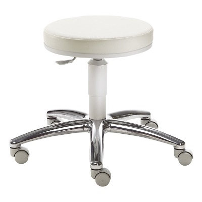 Optimal für die Praxis: Mayer Drehhocker Allround mit Rollen für Hartböden – Der Drehhocker Allround mit Rollen für Hartböden von Mayer ist mit einem robusten, polierten Alu-Fußkreuz ausgestattet, das dem Hocker einen stabilen Stand verleiht. Mithilfe der verbauten Gasfeder lässt sich die Sitzhöhe des Praxishockers einfach von 46 cm bis 51 cm variieren. Die kleinen montierten Rollen eignen sich sowohl für den Einsatz auf Hartböden als auch für den Einsatz auf Teppichböden. Mit einer Sitzfläche von ø 39 cm und einer Polsterdicke von ca. 5 cm ist der Stuhl besonders bequem. Der Bezug aus widerstandsfähigem Kunstleder passt farblich zu fast jeder Praxiseinrichtung. – Produktdetails: – Material Bezug: 3 % Polyurethan, 81 % PVC, 16 % Polyester – Material: Kunststoff, Aluminium – Sitzfläche: ø 39 cm – Polsterstärke: 5 cm – Belastbar bis 120 kg – Gewicht: 5,7 kg – Farbe: Weiß, Lichtgrau