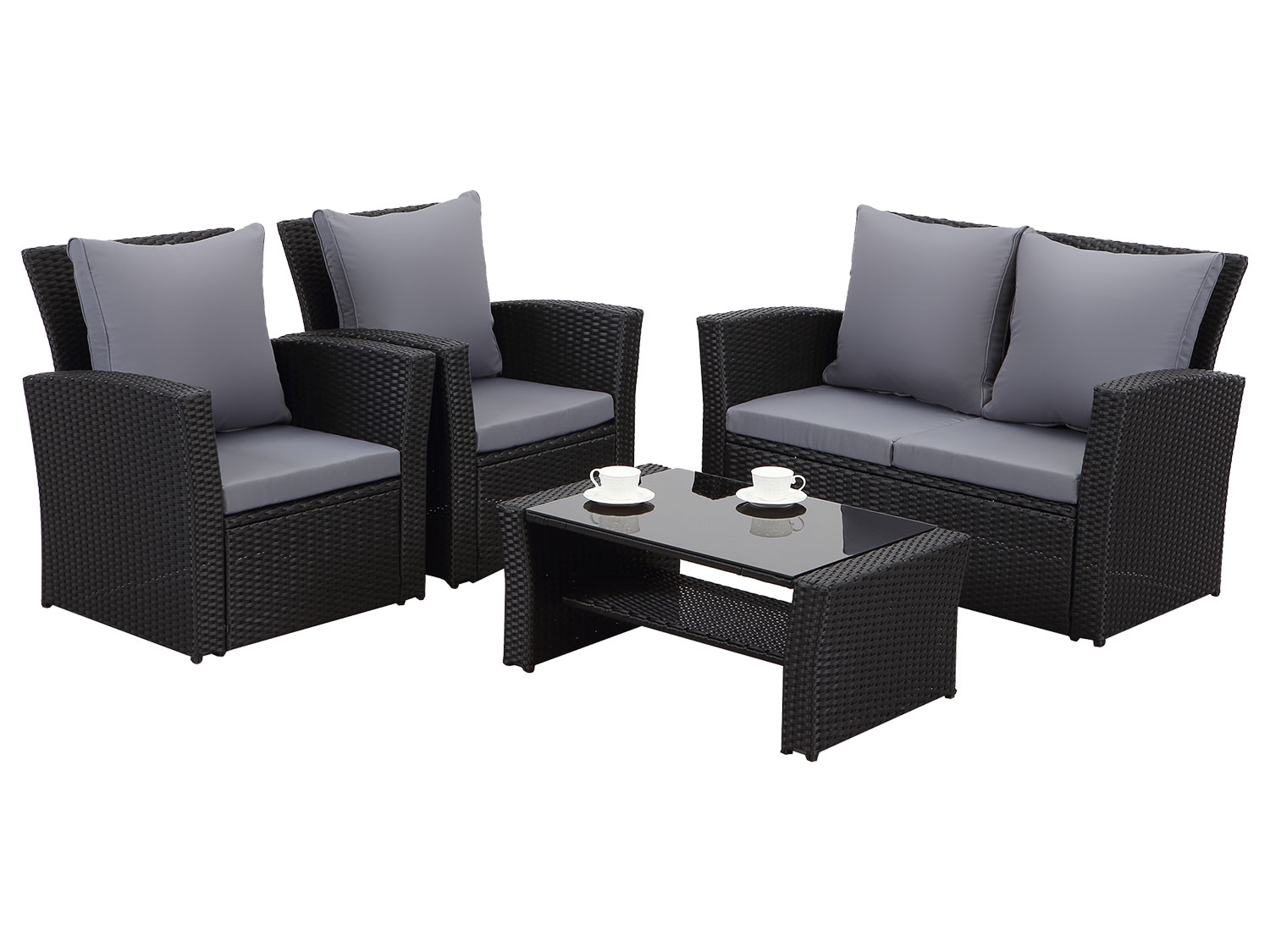 Dieses Lounge-Set verleiht deinem Zuhause ein einzigartiges Gefühl! Ideal für den Indoor & Outdoor Bereich geeigent Wetterfest, wasser- und UV-beständig Angenehmes und bequemes Sitz- und Liegegefühl durch voll gepolsterte Kissen & Rückenkissen Alle Kissenbezüge sind abnehmbar und waschbar Dieses Gartenmöbel-Set besteht aus hochwertigem Polyrattan und Stahlrahmen Leichte & robuste Materialien Individuell zusammenstellbar Ideal für 3-4 Personen Max. Belastung: je Sitz 140 kg Farben: grau/hellgrau, schwarz/grau, dunkelbraun/creme Material Rahmen: 100 % Stahl Kissenbezug: 100 % wasserabweisendes Polyestergewebe Polsterungen: 80 % 3D-Polyesterfasern, 20 % Schwamm (Sitzkissen), 100 % Polyesterfasern (Rückenkissen) Maße Doppelsessel: ca. B 121 x H 80 x T 66 cm Einzelsessel: ca. B 72 x H 80 x T 67 cm Tisch: ca. B 87 x H 35 x T 50 cm Sitzkissen: ca. B 52 x H 50 x T 6 cm Rückenkissen: ca. B 50 x H 53 x T 6 cm Gewicht Doppelsessel: ca. 14,7 kg Einzelsessel: ca. 9,9 kg Tisch: ca. 9,95 kg Lieferumfang 2x Einzelsessel, 1x Doppelsessel, 1x Tisch, 4x Sitzkissen, 4x Rückenkissen; 1x Gebrauchsanleitung