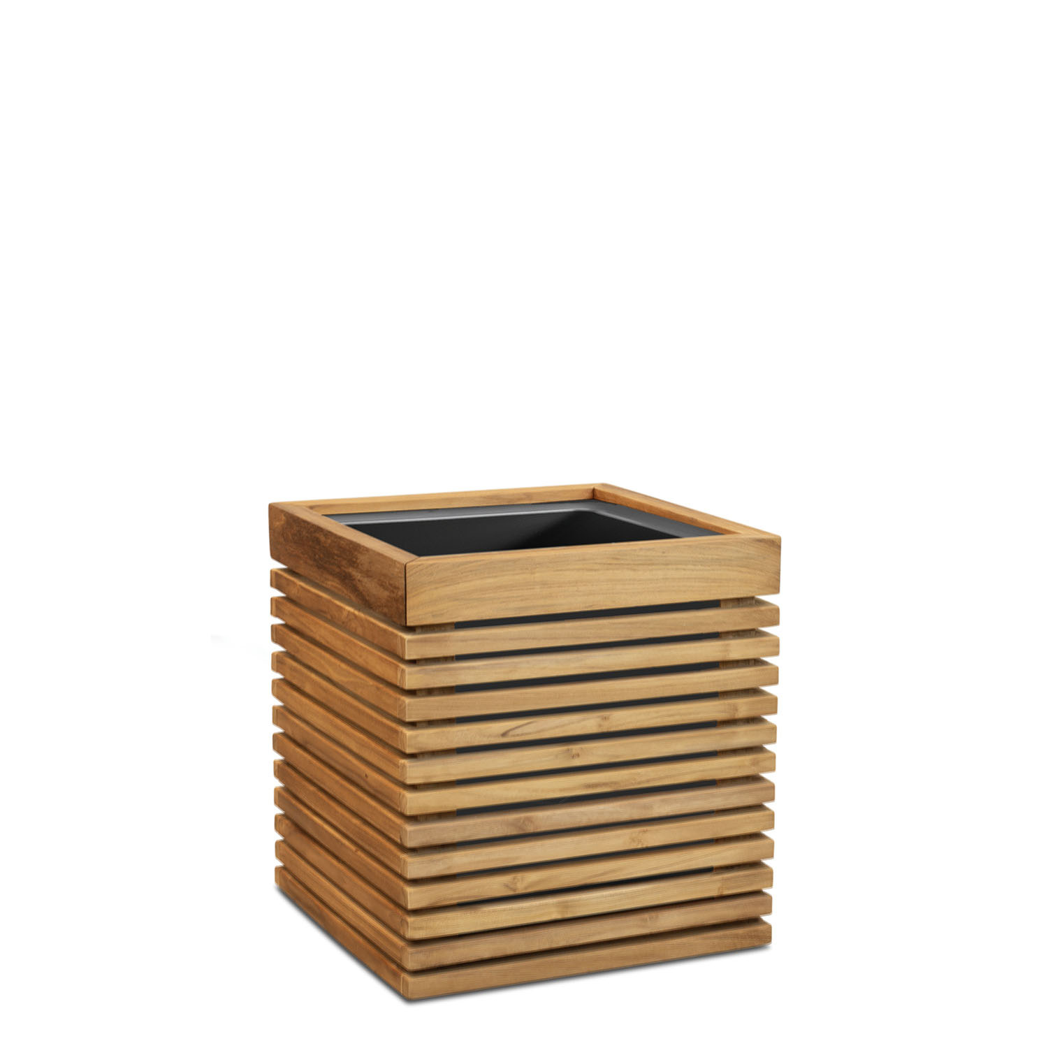 Quadratischer Modulo Pflanzkasten (40 x 40 x 43 cm) aus Teak-Holz, frostfest, UV-stabil, mit herausnehmbarem Pflanzeinsatz und optionalen Rollen, ideal für stilvolle Gartengestaltung.