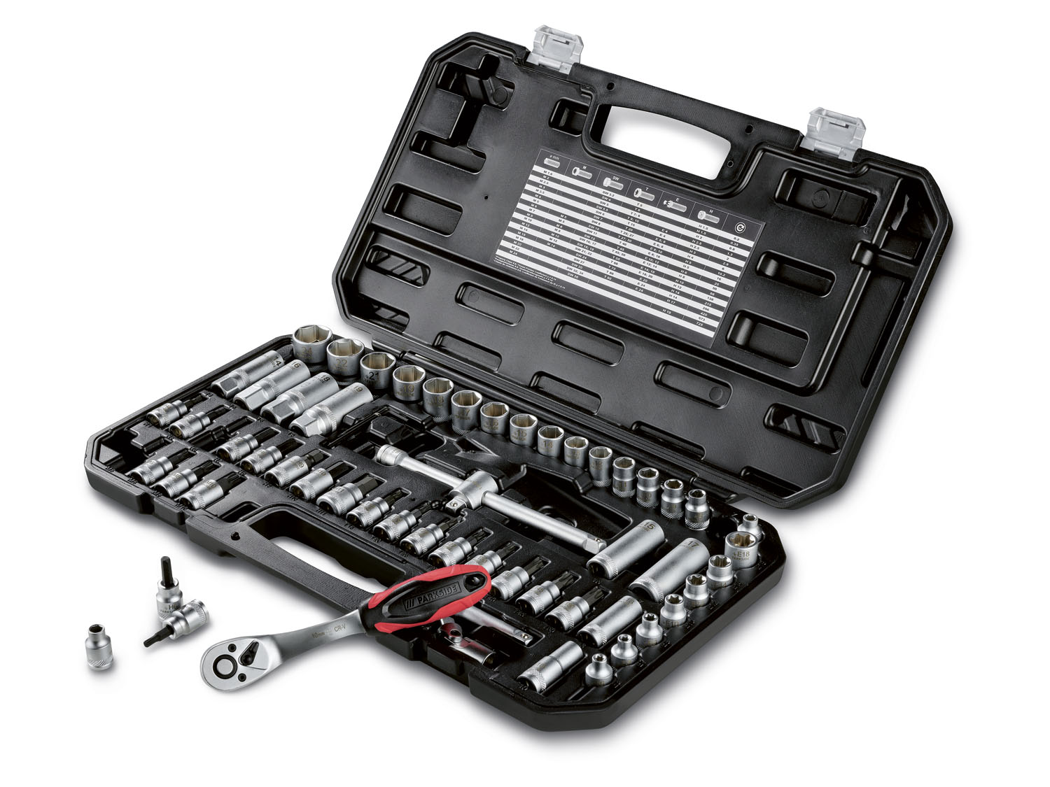 Hochwertige Verarbeitung aus Chrom-Vanadium-Stahl und S2-Stahl mit 3/8″ (10 mm) Aufnahmen In matt-finish – gut erkennbare Größen durch Lasermarkierungen 65-teilig: 1x Ratsche, rechts/links umschaltbar (72 Zähne); gekröpft mit Schnelllösefunktion 1x Verlängerung 75 mm 1x Verlängerung 200 mm 1x Gleitstück 1x Kardangelenk 4x Zündkerzenschlüssel mit gelasertem Zündkerzenpiktogramm 4x Tiefbetteinsatz 17x Steckschlüsseleinsatz 20x Schraubendrehereinsatz 7x E-Profil-Steckschlüsseleinsatz 5x Innensechskantschlüssel 3x TX-Stiftschlüssel Material Chrom-Vanadium-Stahl Maße ca. 47,5 x 27,5 x 5,5 cm Gewicht ca. 3,2 kg
