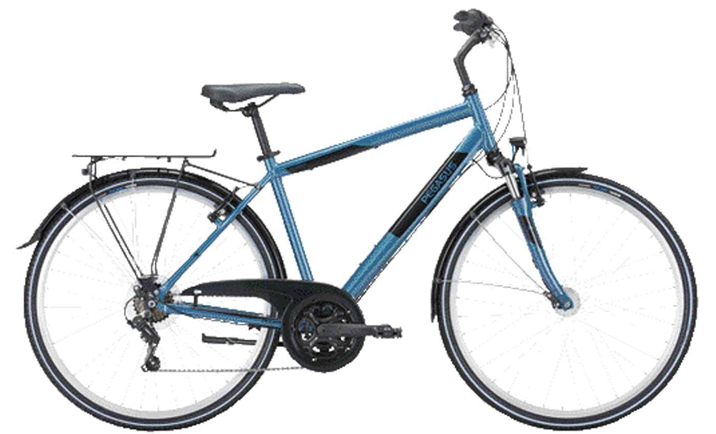 Pegasus Avanti 18 Das Pegasus Avanti 18 bietet die vertraute Pegasus Qualität zu einem erschwinglichen Preis. Die Marke der ZEG (Zweirad-Einkaufs-Genossenschaft) mit dem geflügelten Pferd, steht für eine gelungene Kombination aus Qualität, Design und Alltagstauglichkeit. Die Tatsache, dass Pegasus eine der meistgekauften Marken in Deutschland ist, unterstreicht, dass dieser Mix erfolgreich ist. Mit über 40 Jahren Erfahrung hat Pegasus das Vertrauen der Kunden gewonnen und beweist kontinuierlich ihre Zuverlässigkeit. Das Avanti 18 in pro blue und als Diamantrahmen bietet die klassischen Merkmale des Trekkingbikes zum kleinen Preis. Dazu gehört die 18-Gang-Kettenschaltung mit drei Kettenblättern vorne, ebenso eine stoßmindernde Federgabel und helle LED-Beleuchtung mit ausfallsicherem Nabendynamo und Standlicht hinten. Verzögert wird mit kräftigen, einfach zu wartenden Felgenbremsen. Mit dem geschwungenen Lenker sitzt es sich schön aufrecht, was im Alltag und auf Touren sehr angenehm ist. Das mit einem soliden Gepäckträger ausgestattete Trekkingbike ist in drei Rahmenvarianten verfügbar und wird in mehreren attraktiven Farbvarianten angeboten. Wenn Sie ein gutes Trekkingrad für Alltag und Touren zu einem günstigen Preis suchen, ist das PEGASUS Avanti 18 die richtige Wahl!
