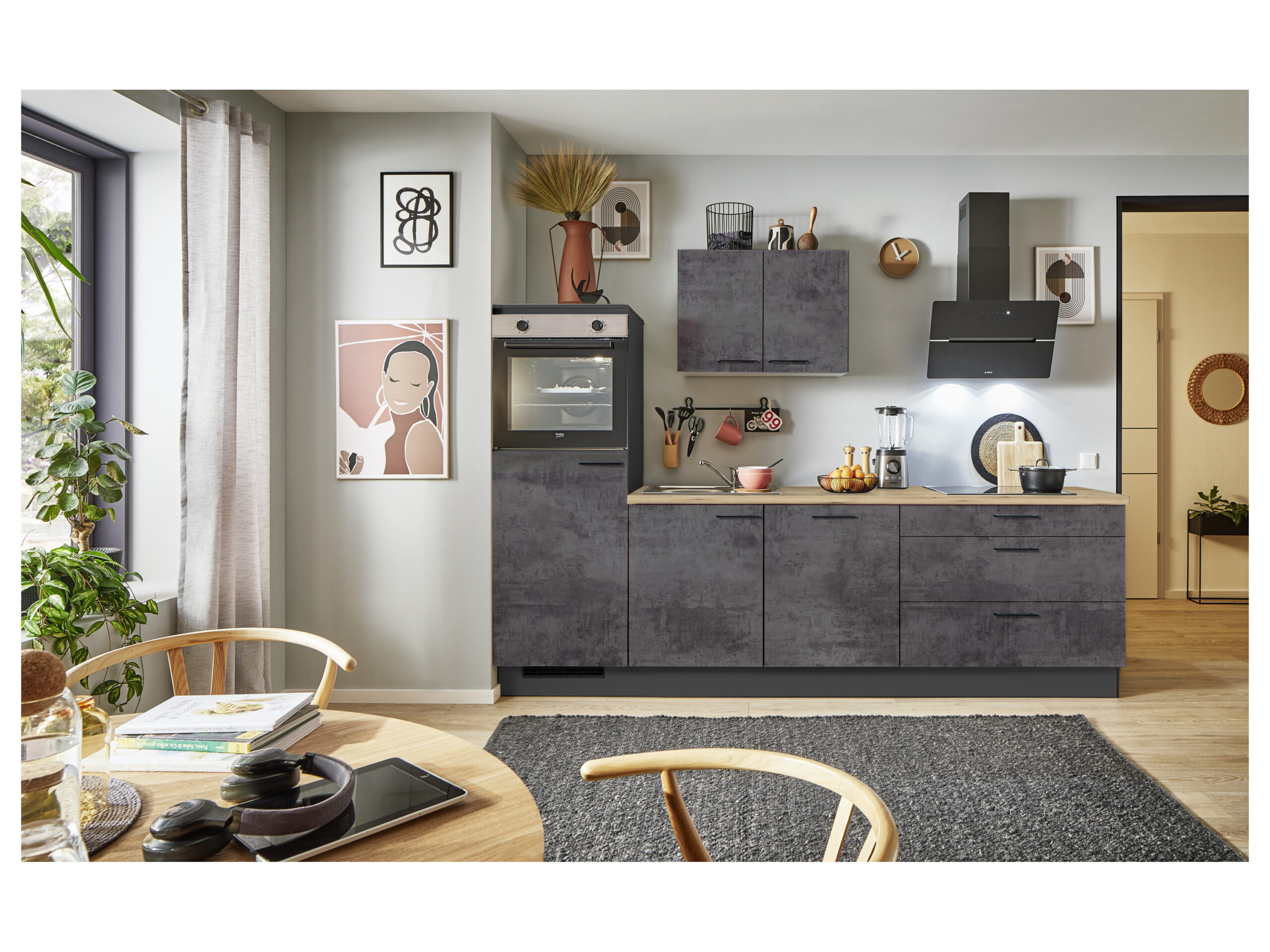 Küchenzeile mit Elektrogeräten sowie Spüle und Armatur in der Farbe Weiß Schränke sind vormontiert für einen super-einfachen Aufbau Bebilderte Montageanleitung liegt bei Hergestellt in Deutschland Lieferung per Profi-Spedition schnell & zuverlässig Enthaltene Komponenten (beide Varianten): Highboard für Backofen und Kühl-/Gefrierkombination: 1 Drehtür; Anschlag links/rechts, ca. 60 x 174,2 x 57,6 cm Frontplatte für Geschirrspüler: ca. 60 x 87,8 x 1,6 cm Hängeschrank: 2 Drehtüren; Anschlag links/rechts, ca. 80 x 57,9 x 34,2 cm Edelstahlspüle mit Hahnlochbohrung Mischbatterie Hochdruck Sockelpaket Ceranfeld: Beko Eb9741Xhl Geschirrspüler: Beko Bdin14N22 Backofen: Beko Bbie110Nox Kühl-/Gefrierkombination: Beko B1754N oder Beko Bdsa250K4Sn Kopffreihaube: Elica Wisebla60 mit Aktivkohlefilter Cfc0140343 Zusätzliche Komponenten Variante 270 cm: Unterschrank für autarkes Kochfeld: 1 Schubkasten, 2 Auszüge; ca. 90 x 87,8 x 57,6 cm Unterschrank für Spüle: 1 Drehtür; Anschlag rechts/links, ca. 60 x 87,8 x 57,6 cm Arbeitsplatte: ca. 210 x 60 x 3,88 cm Zusätzliche Komponenten Variante 280 cm: Seitenschrank: 1 Drehtür; ca. 30 x 174,2 x 57,6 cm Unterschrank für autarkes Kochfeld: 1 Schubkasten, 2 Auszüge; ca. 80 x 87,8 x 57,6 cm Unterschrank für Spüle: 1 Drehtür; Anschlag rechts/links, ca. 50 x 87,8 x 57,6 cm Arbeitsplatte: ca. 190 x 60 x 3,88 cm Produktmerkmale Style: Classic Varianten: ca. 270 cm; ca. 280 cm – jeweils mit Anschlag links oder rechts Farbe: Weiß; Beton Grafitgrau, Lichtgrau Hochglanz Elektrogeräte : Backofen: Beko Bbie110Nox; Ceranfeld: Beko Eb9741Xhl; Geschirrspüler: Beko Bdin14N22; Kühl-/Gefrierkombination: Beko B1754N oder Beko Bdsa250K4Sn; Kopffreihaube: Elica Wisebla60 Breite: ca. 270 cm; ca. 280 cm Beleuchtung: keine Angabe Spüle: Edelstahlspüle mit Hahnlochbohrung Arbeitsplatte: Variante 270 cm: ca. 210 x 60 x 3,88 cm; Variante 280 cm: ca. 190 x 60 x 3,88 cm Schränke: Vormontiert zum Selbstaufbau Max. Belastung: Einlegeboden: 50 kg/m² Material: Spanplatte Maße: Variante 270 cm: ca. B 270 x H 174 x T 60 cm; Variante 280 cm: ca. B 280 x H 174 x T 60 cm Gewicht: Variante 270 cm: ca. 327,4 kg; Variante 280 cm: ca. 346,6 kg Lieferumfang: 1x Küchenzeile (Variante 270 cm oder 280 cm), 1x Highboard, 1x Frontplatte für Geschirrspüler; 1x Hängeschrank; 1x Edelstahlspüle; 1x Mischbatterie, 1x Sockelpaket, 1x Ceranfeld, 1x Geschirrspüler; 1x Backofen, 1x Kühl-/Gefrierkombination; 1x Kopffreihaube, 1x Arbeitsplatte, 1x Unterschrank für Kochfeld, 1x Unterschrank für Spüle; 1x Montageanleitung; Variante 280 cm zusätzlich: 1x Seitenschrank