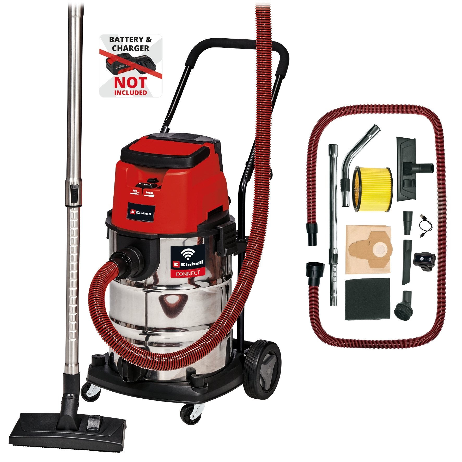 Der Einhell Akku-Nass-Trockensauger wird als leistungsstarkes Mitglied der Power X-Change-Familie von 2x PXC-Akkus angetrieben. Die Lieferung erfolgt ohne Akku und Ladegerät, diese sind separat erhältlich. Empfohlen werden 3,0 Ah-Akkus und größer. Dank Konnektivitätsfunktion startet die Absaugung automatisch beim Starten des Akku-Werkzeugs. Der Akku-Sauger verfügt über einen ECO- und einen BOOST-Modus, einen 30 l rostfreien Edelstahlbehälter mit Wasserablassschraube, einen Blasanschluss, eine Zubehörhalterung sowie große Räder und Rollen. In der Lieferung inklusive ist ein Edelstahl-Teleskoprohr, ein 2,50 m Plastiksaugschlauch, eine große Kombi-, Fugen-/Polsterdüse, diverse Filter sowie die Sendereinheit für die Konnektivität.